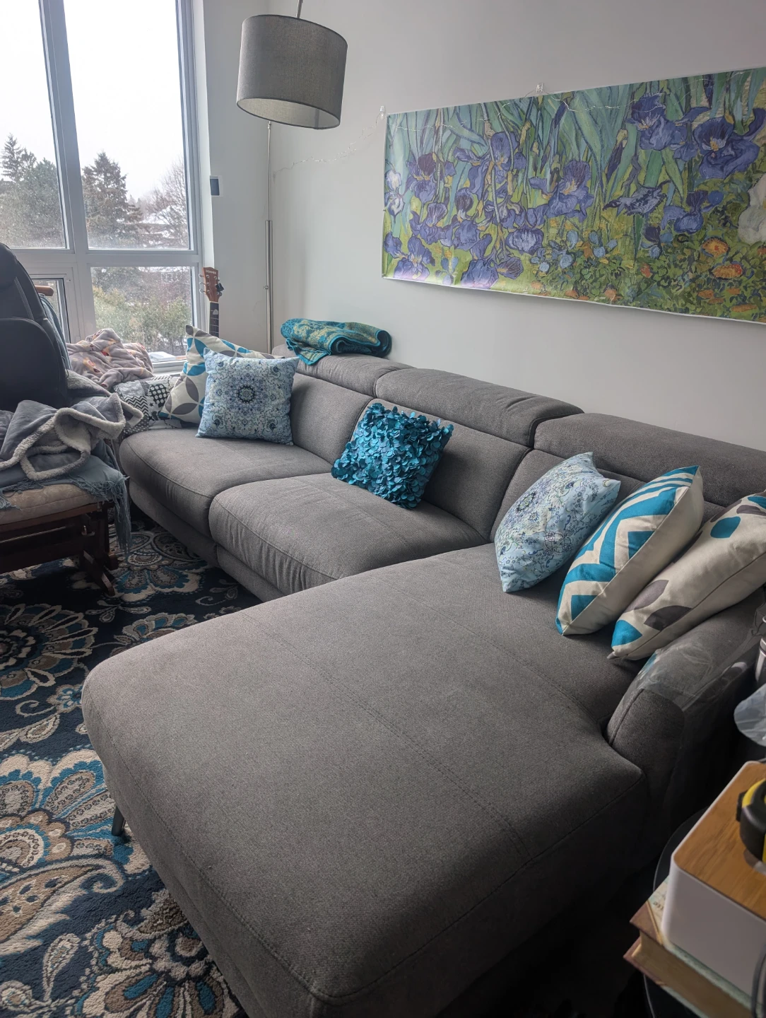 A comfy grey sectional sofa, left-hand chaise (when sitting in it) It features adjustable headrests for personalized comfort. Grey tweed fabric, Scotchgard-ed. Approx two years old. Right-hand seat is power recliner. When new, was priced at $1200 approx. (Throw pillows not included.). Delivery not available, you must arrange that yourself; unit separates into two easy to handle parts. Elevator available. cash or e-transfer only.
