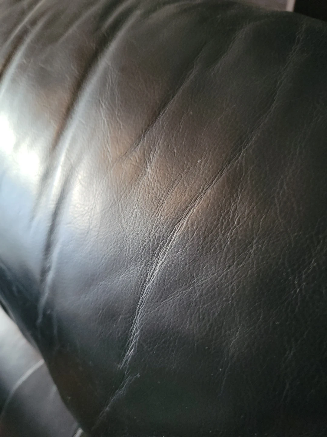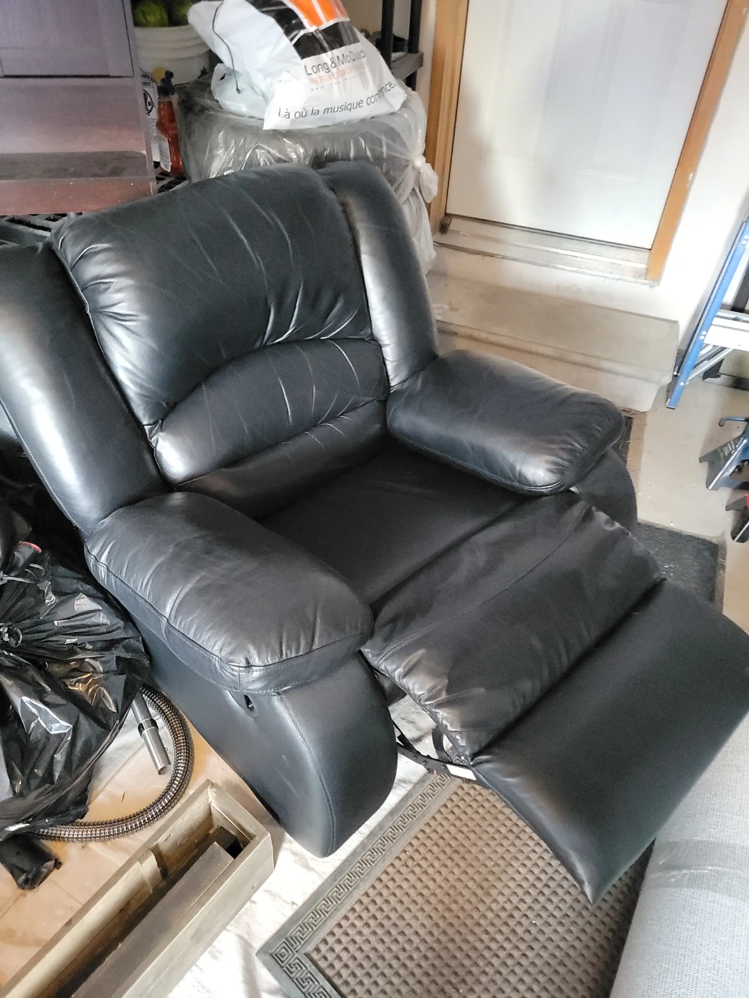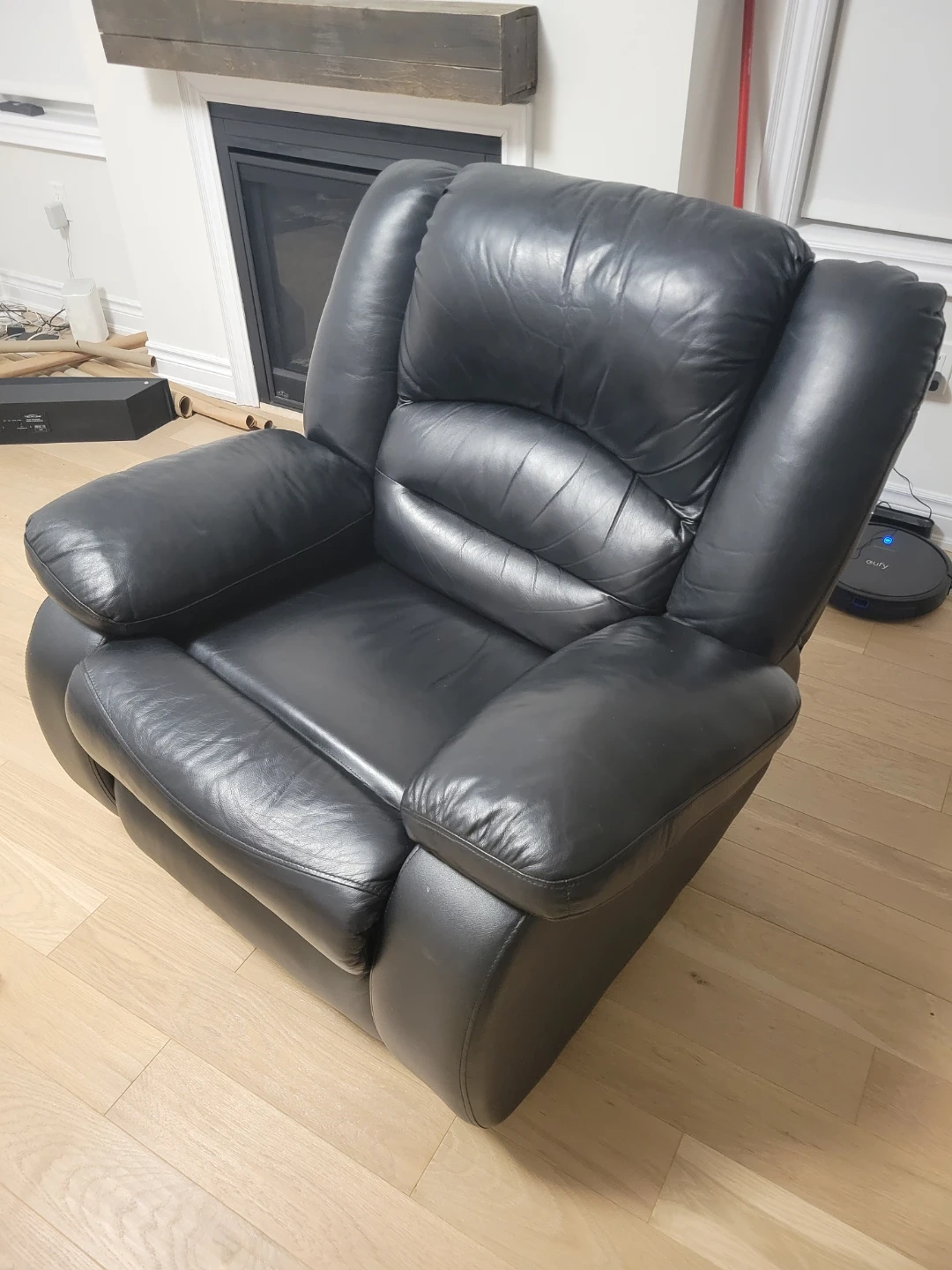 Comfortable black leather recliner chair with a manual reclining mechanism. Its plush cushioning offers great support. Perfect for relaxing after a long day!