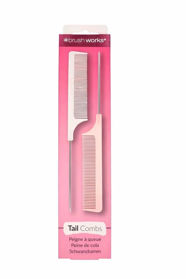 This is a professional set of two Brushworks tail combs, designed for precise hair parting, sectioning, and styling. Each comb features a fine-toothed body and a pointed needle handle. They are lightweight and durable.