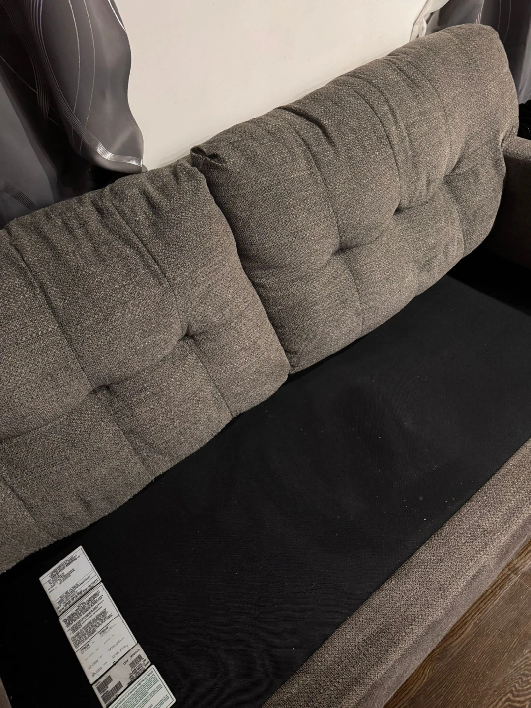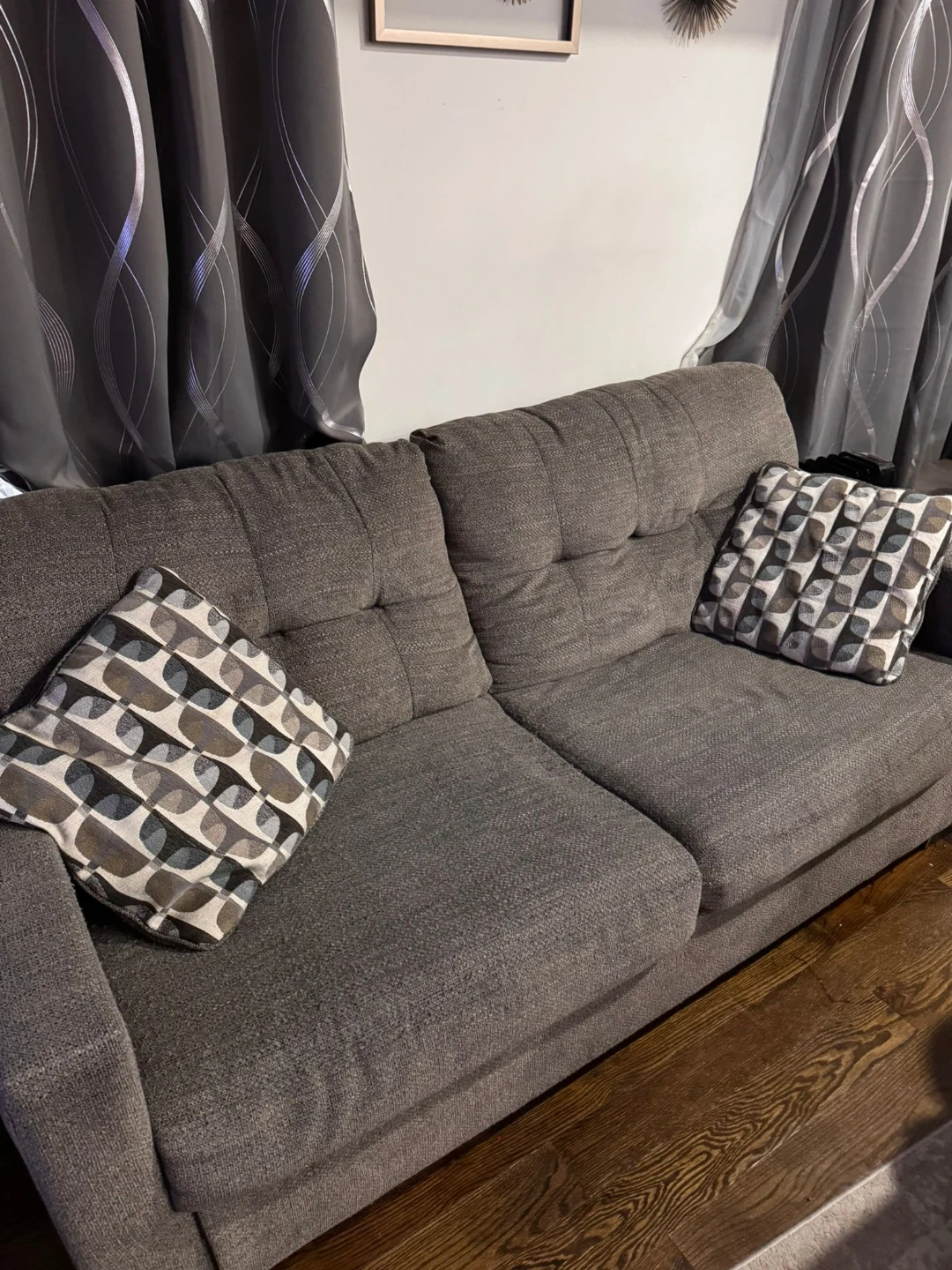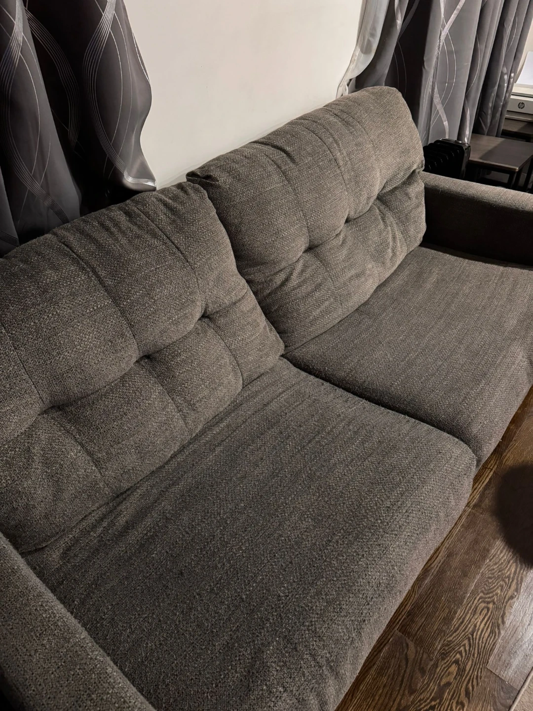 Gray upholstered loveseat. Seat cushions consist of polyurethane foam pad and polyester fiber batting. Bolsters made of polyester fiber. Seat depth is approximately 74 inches love seat 52 inches.