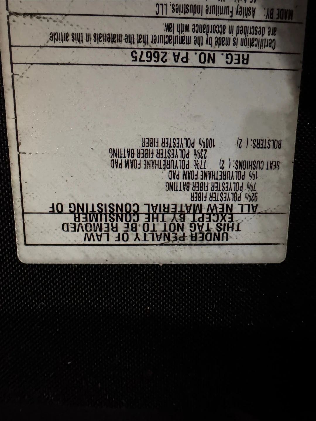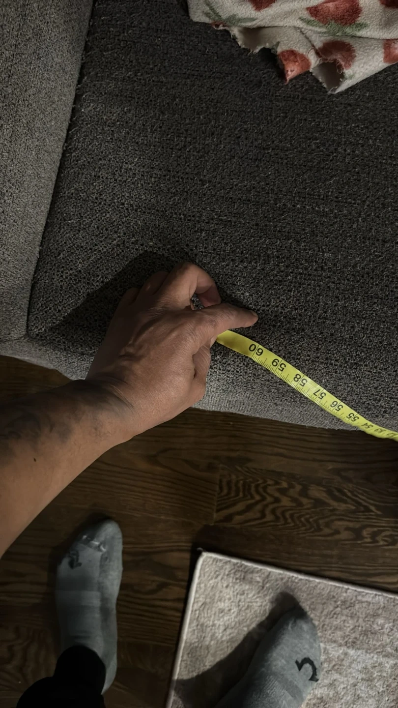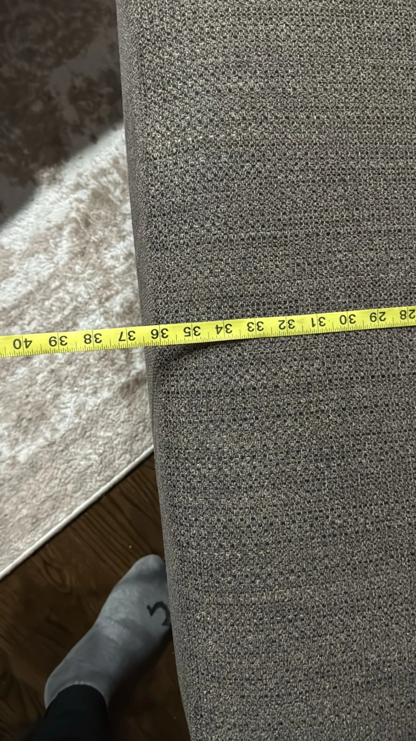 Gray upholstered loveseat. Seat cushions consist of polyurethane foam pad and polyester fiber batting. Bolsters made of polyester fiber. Seat depth is approximately 74 inches love seat 52 inches.