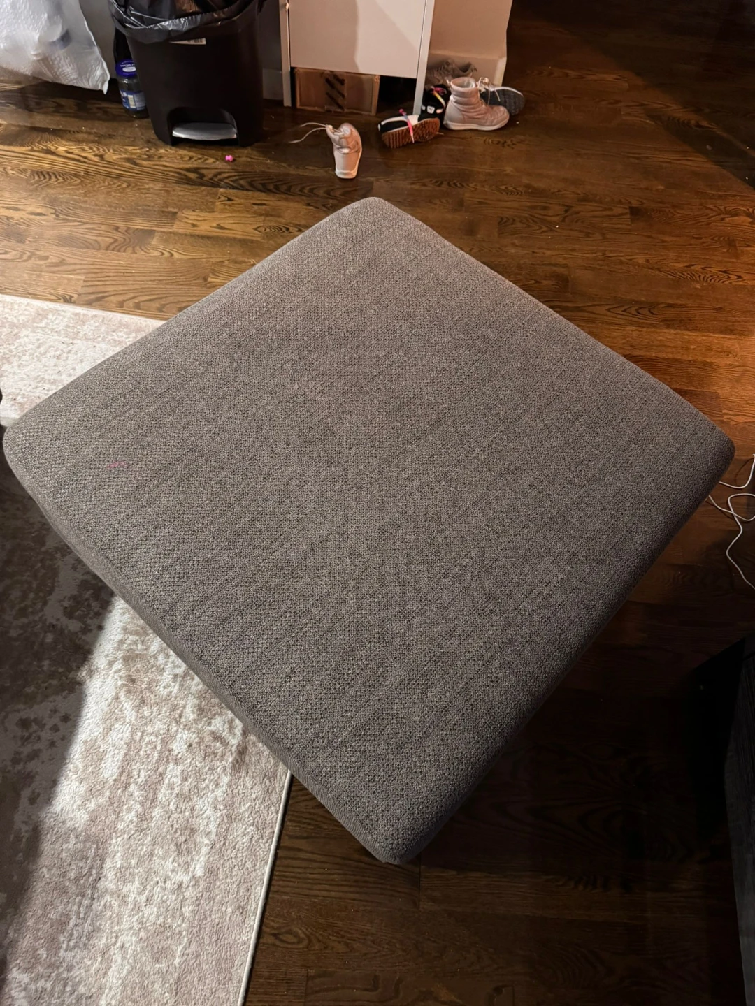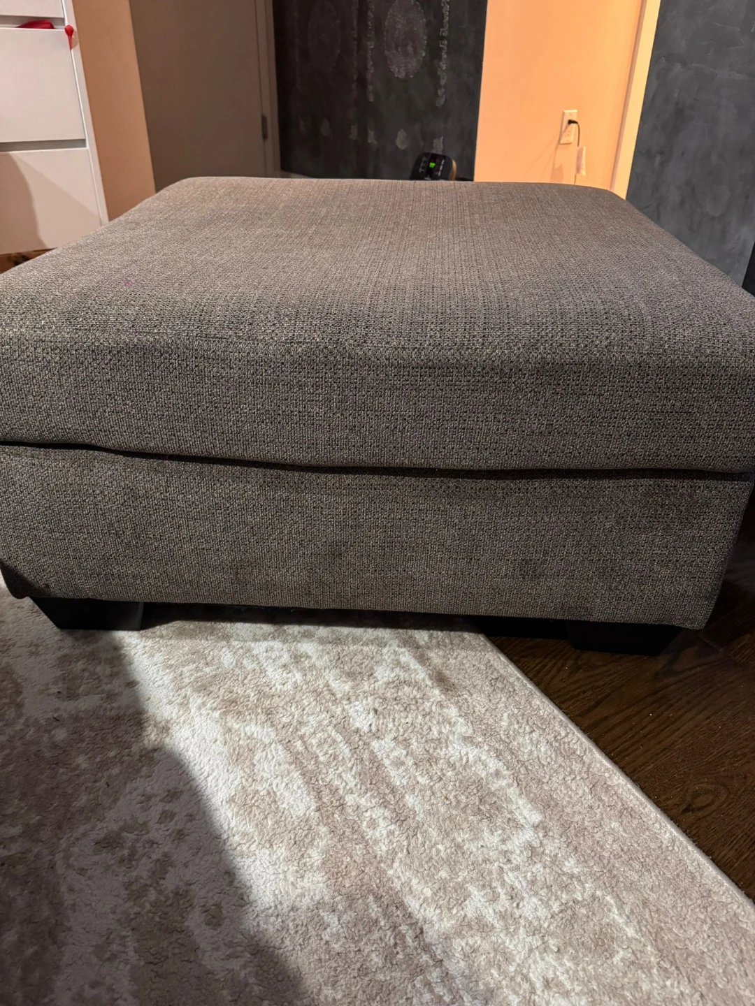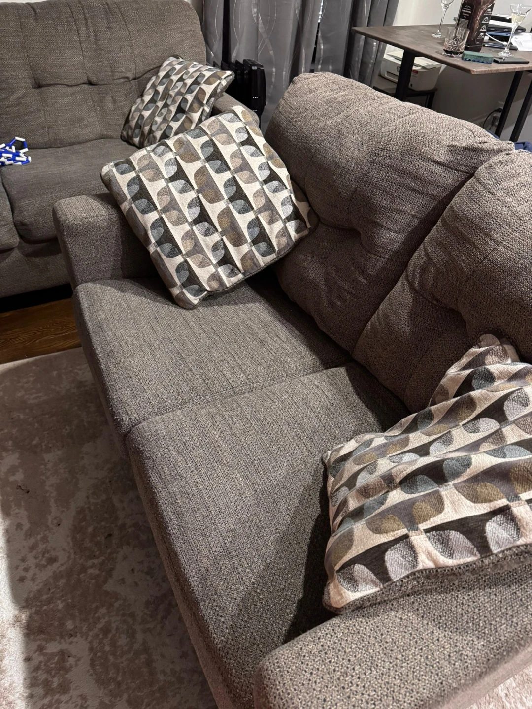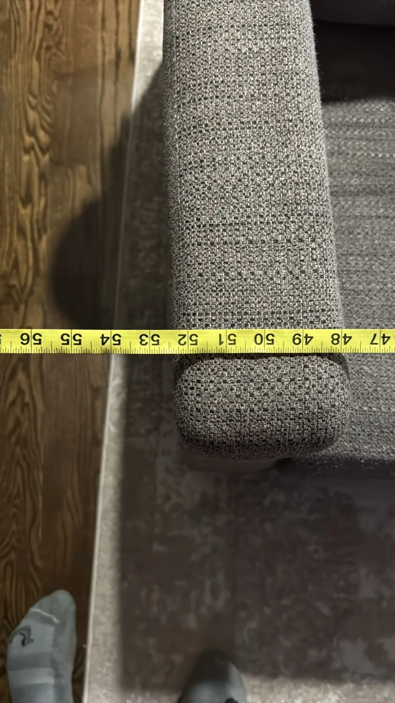 Gray upholstered loveseat. Seat cushions consist of polyurethane foam pad and polyester fiber batting. Bolsters made of polyester fiber. Seat depth is approximately 74 inches love seat 52 inches.