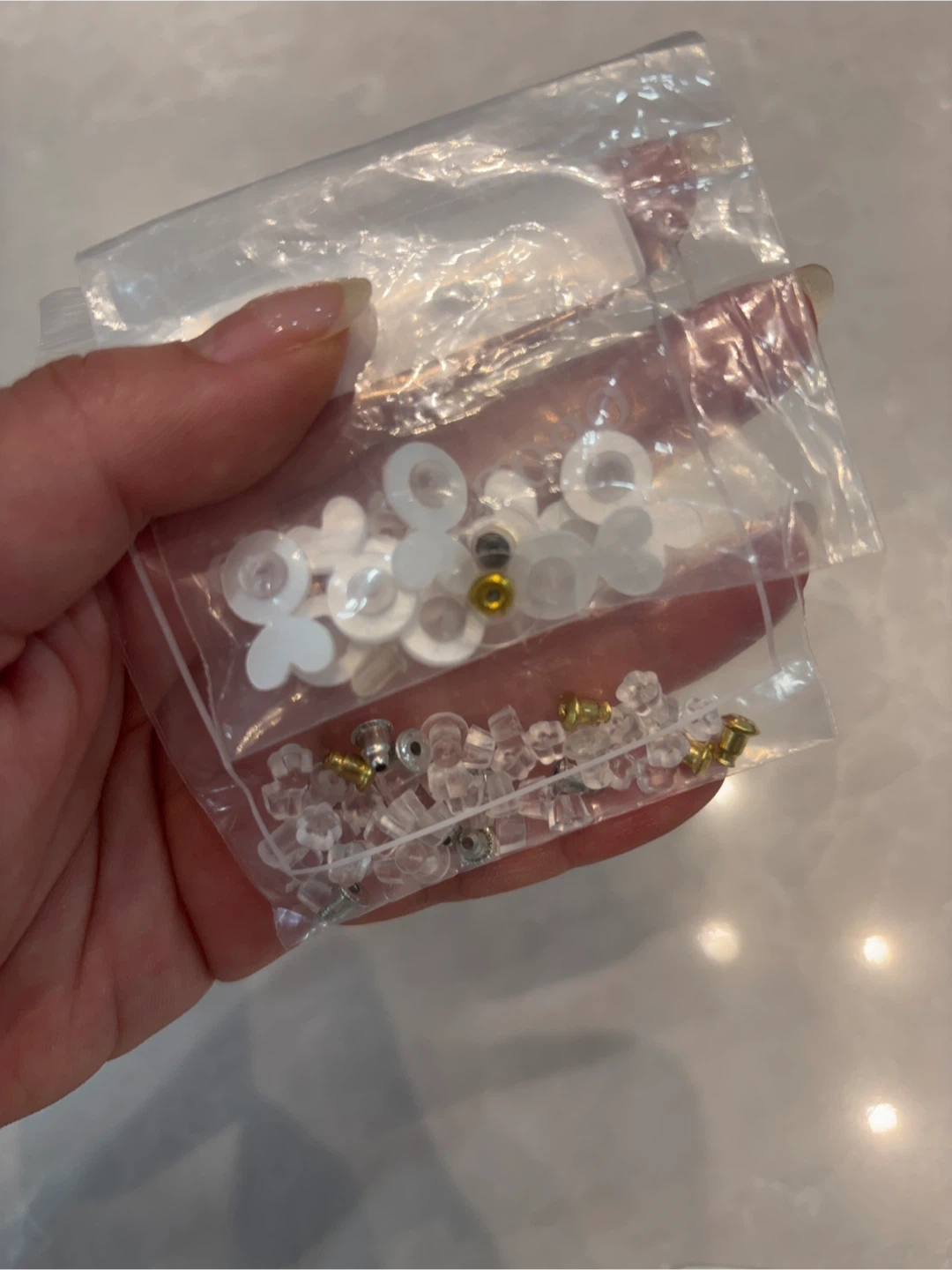 A variety of clear and metal earring backs and findings for jewelry repair or replacement. Includes butterfly backs, clear stoppers, and some decorative white pieces. Keep your earrings secure!
