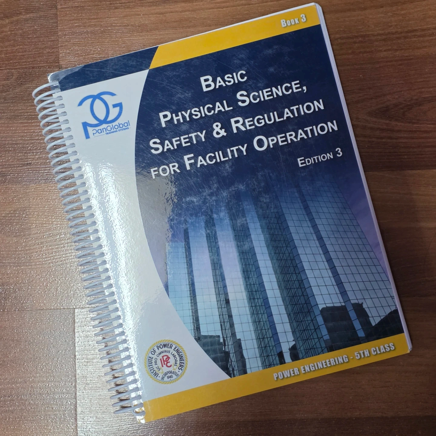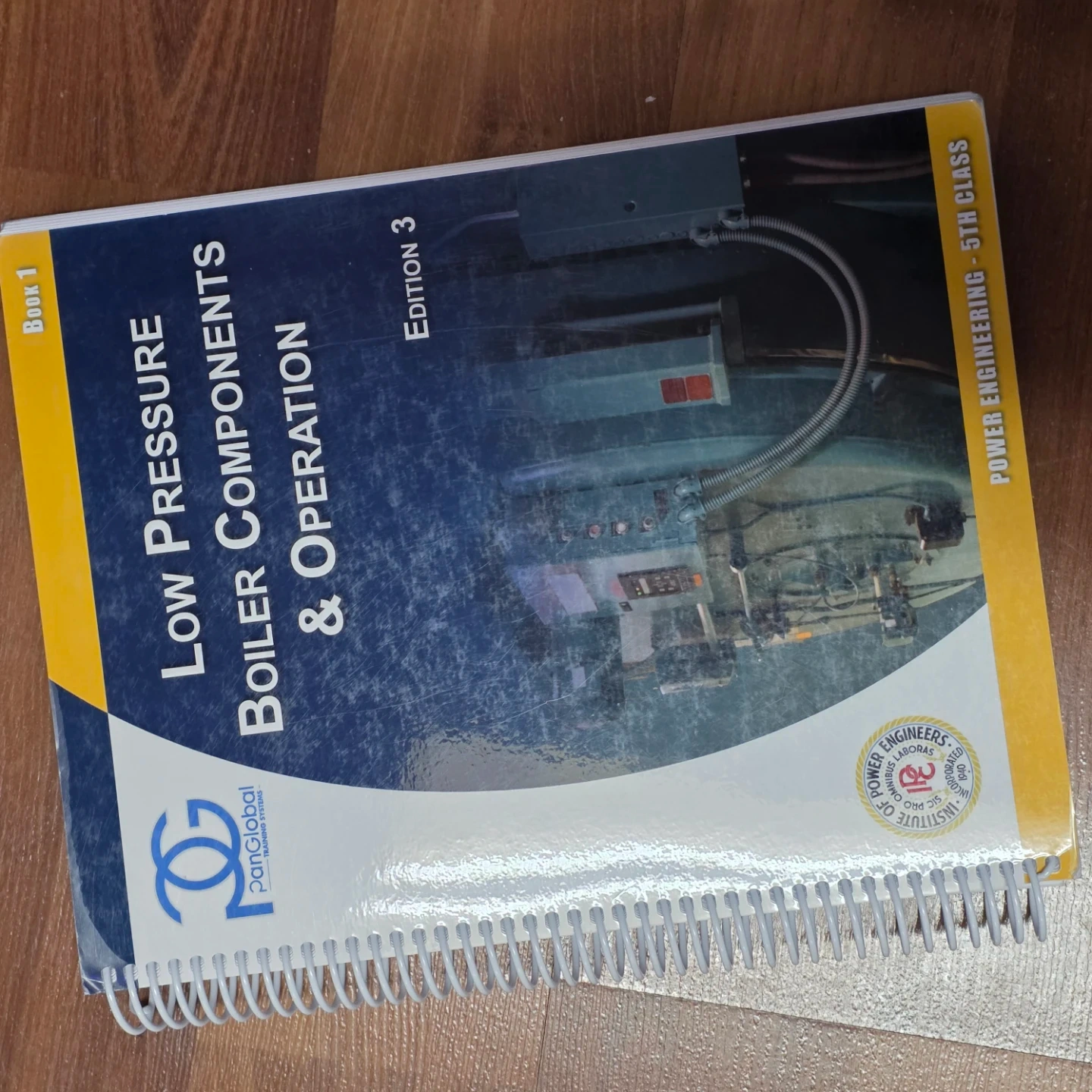 Set of four training books from PanGlobal for Facility Operation and Power Engineering. Includes 'Low Pressure Boiler Components & Operation', 'Elements of Human Comfort', 'Basic Physical Science, Safety & Regulation', and an 'Academic Supplement' with Steam Tables and Refrigeration Tables.