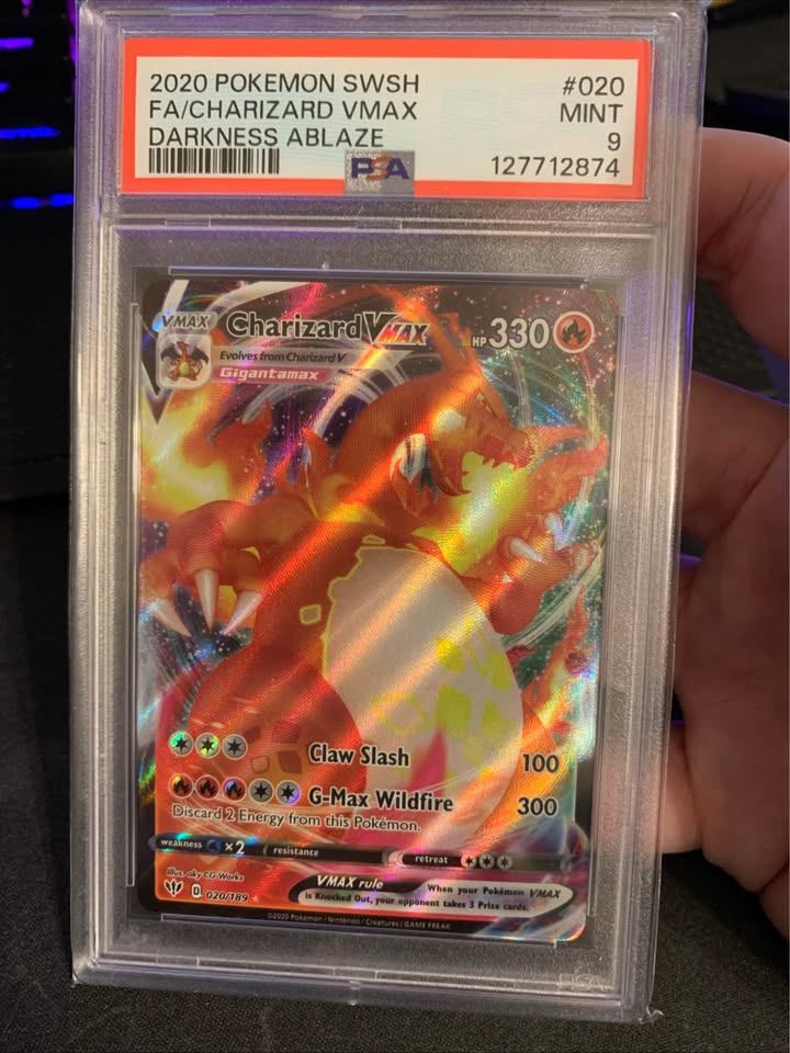 Selling a 2020 Pokemon SWSH FA/Charizard VMAX Darkness Ablaze card, graded Mint 9 by PSA! This card features Charizard VMAX and has attacks like Claw Slash (100) and G-Max Wildfire (300). A great addition to any collection!