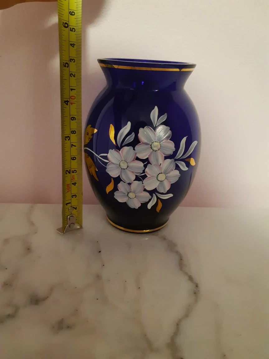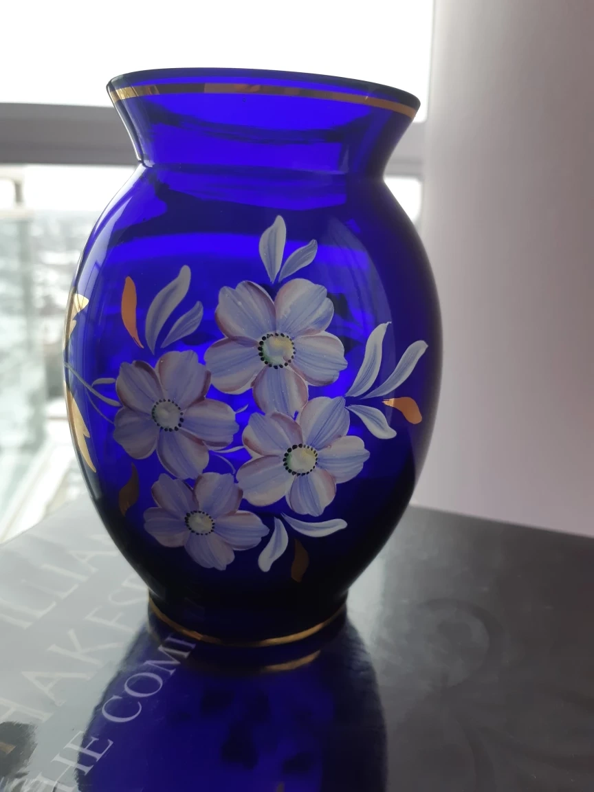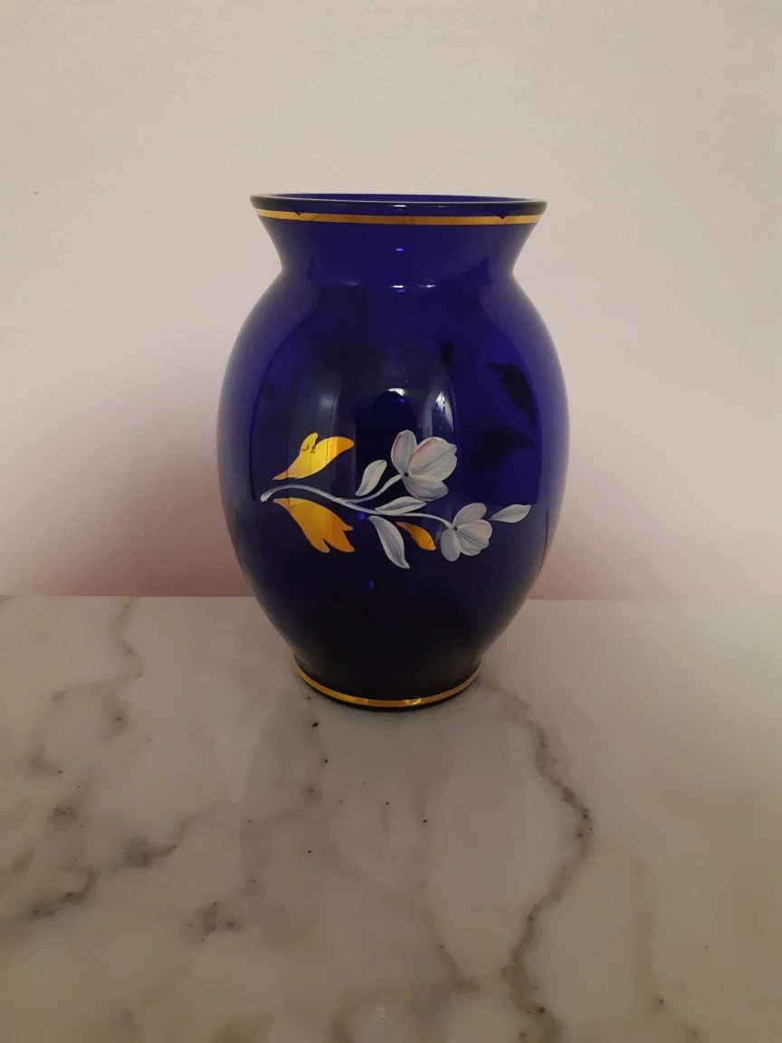 Hand-Painted Cobalt Blue Glass Vase with Floral Design