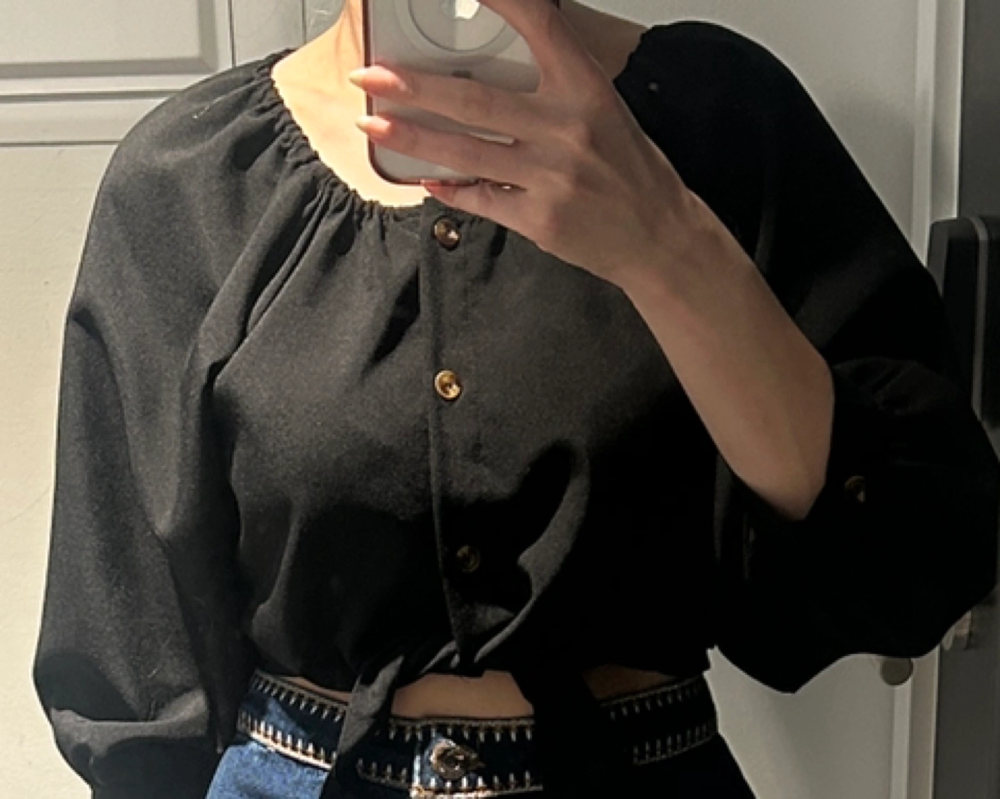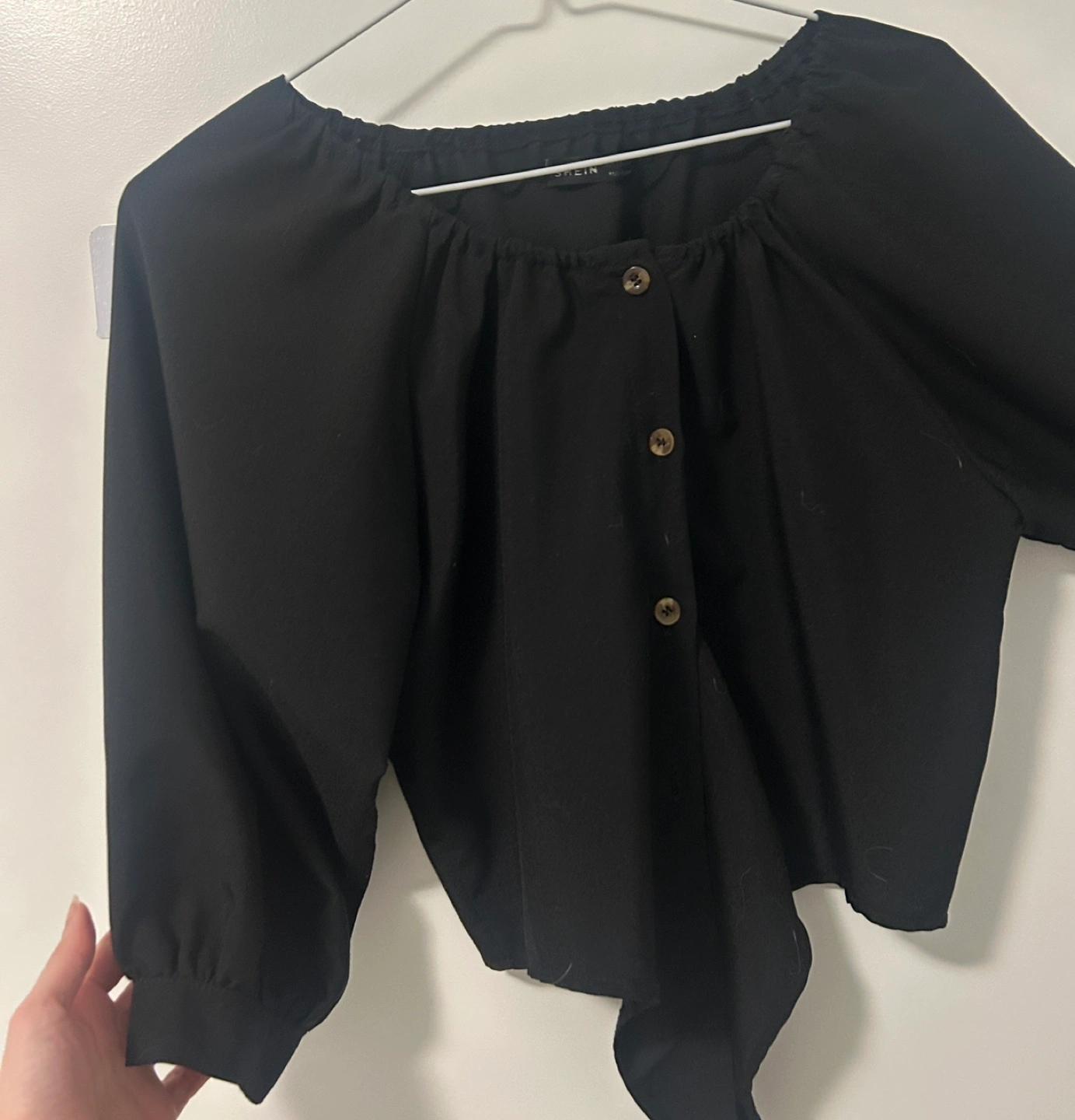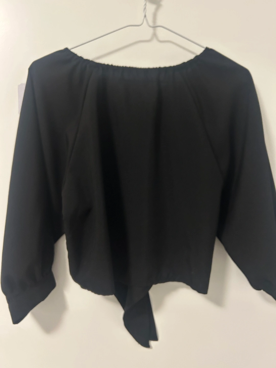Black cropped blouse. Three-quarter sleeves. Button front. Tie detail at the waist. Soft material.