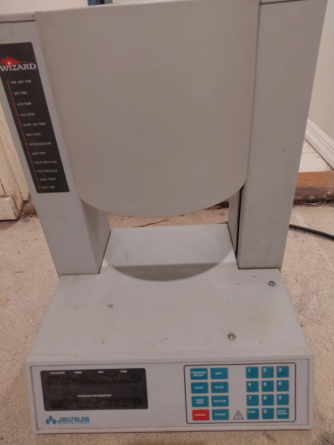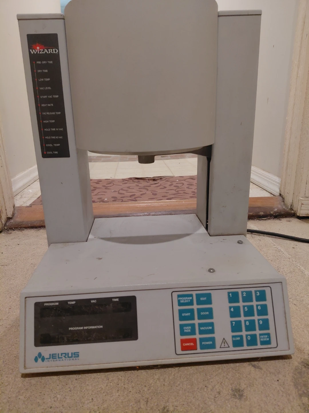 This is a Jelrus Wizard kiln. It has a digital display and keypad for programming temperature and time cycles. It features various settings for pre-dry time, low temp, vac level, and heat rate.