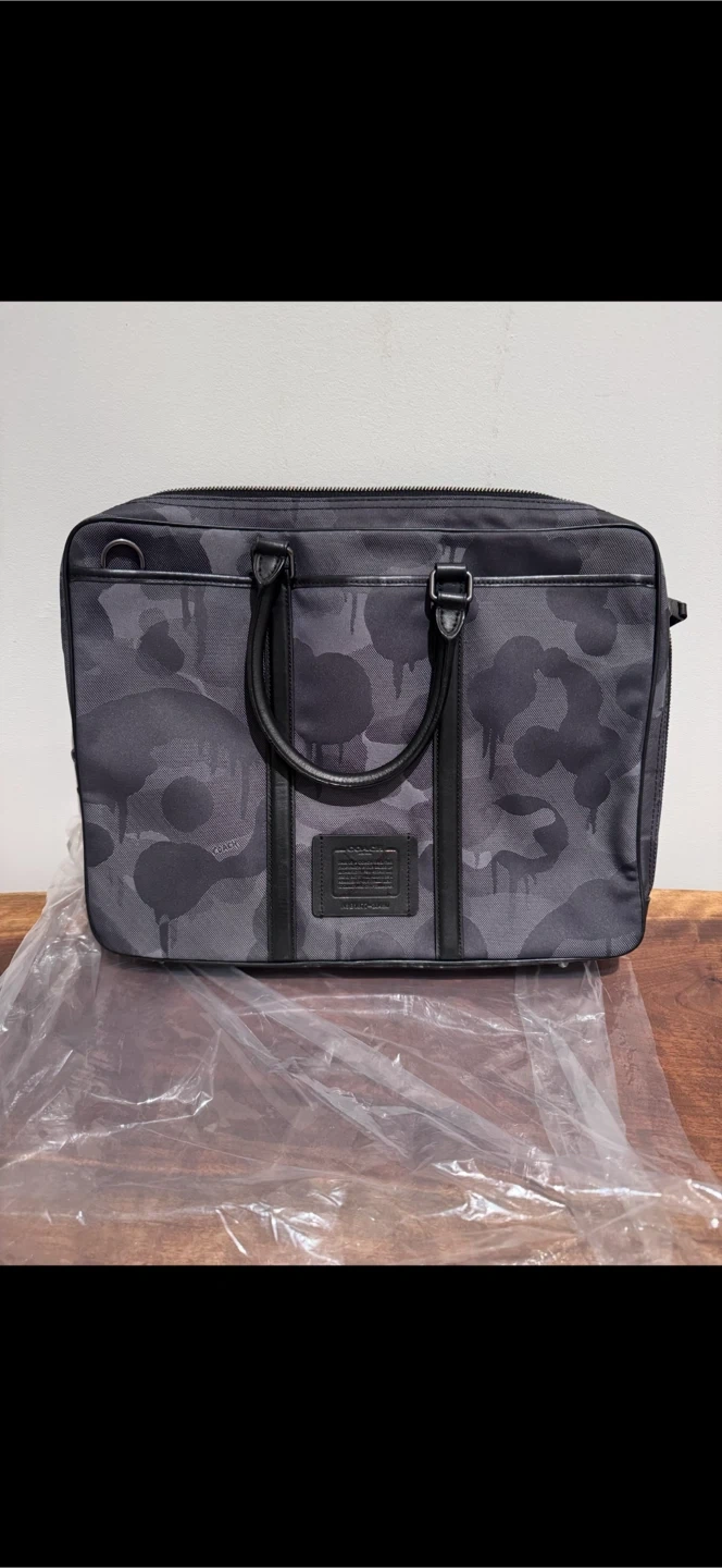 Here's a stylish Coach briefcase with a cool camo print and leather trim. It's perfect for carrying your laptop and documents in style. The bag is in great shape and ready for a new owner.