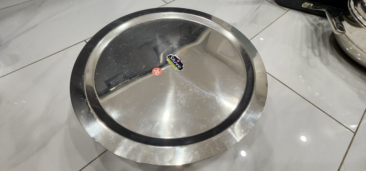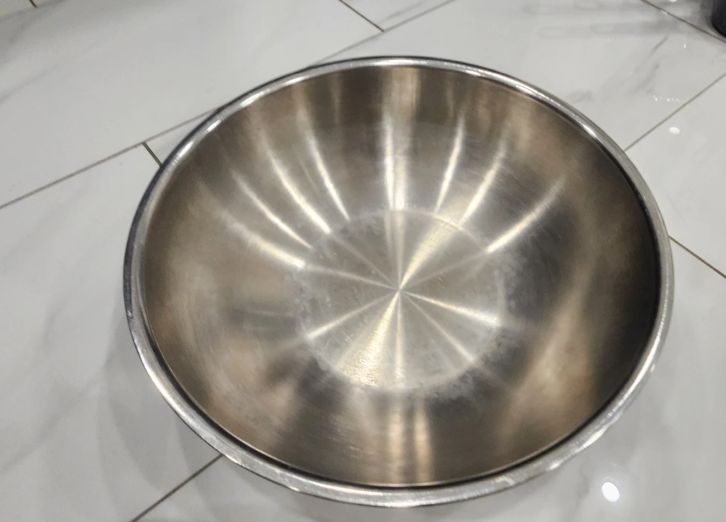High-quality stainless steel cooking bowl in good condition. Strong, durable, and rust-resistant.