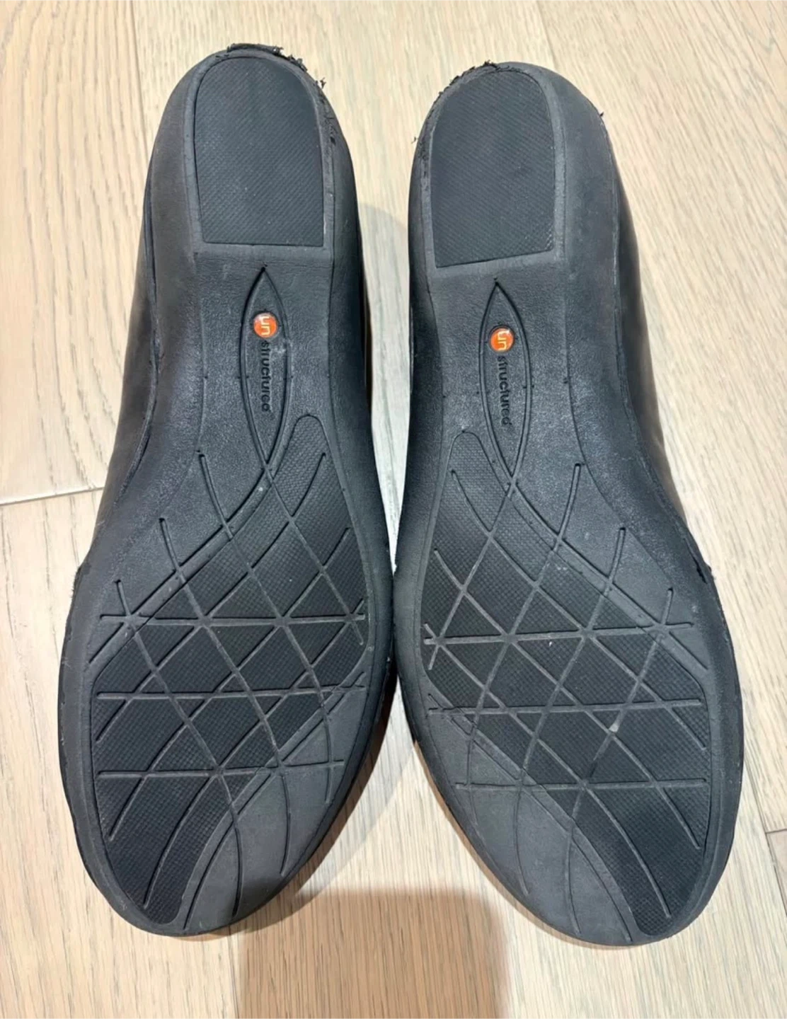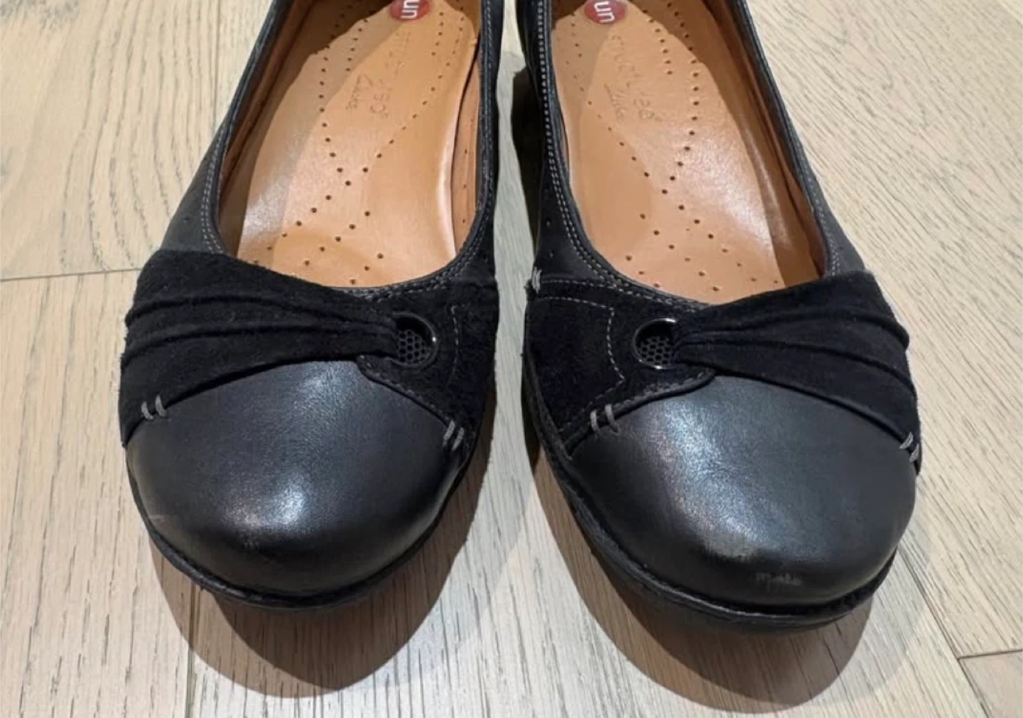 These are a pair of Clarks Unstructured black leather flats. They feature a stylish design with a suede accent. Perfect for everyday wear! There are scuff marks on shoe as shown in photos.