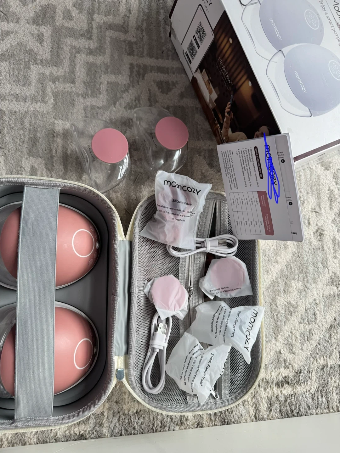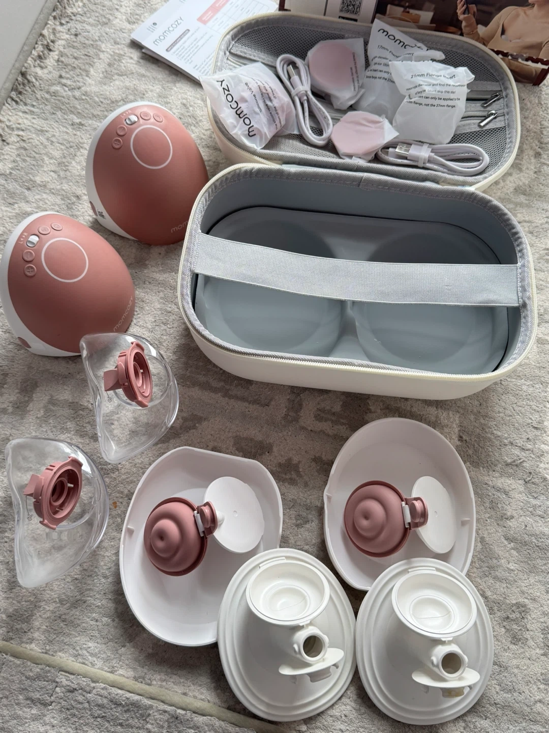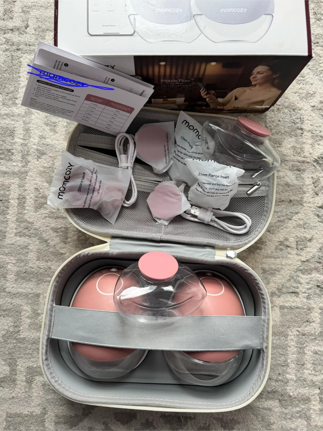 Momcozy wearable breast pump, Model Mobile Flow, in pink. Includes two pumps, charging cables, and a carrying case. Offers multiple flange insert sizes. And all parts available, most of parts never used.