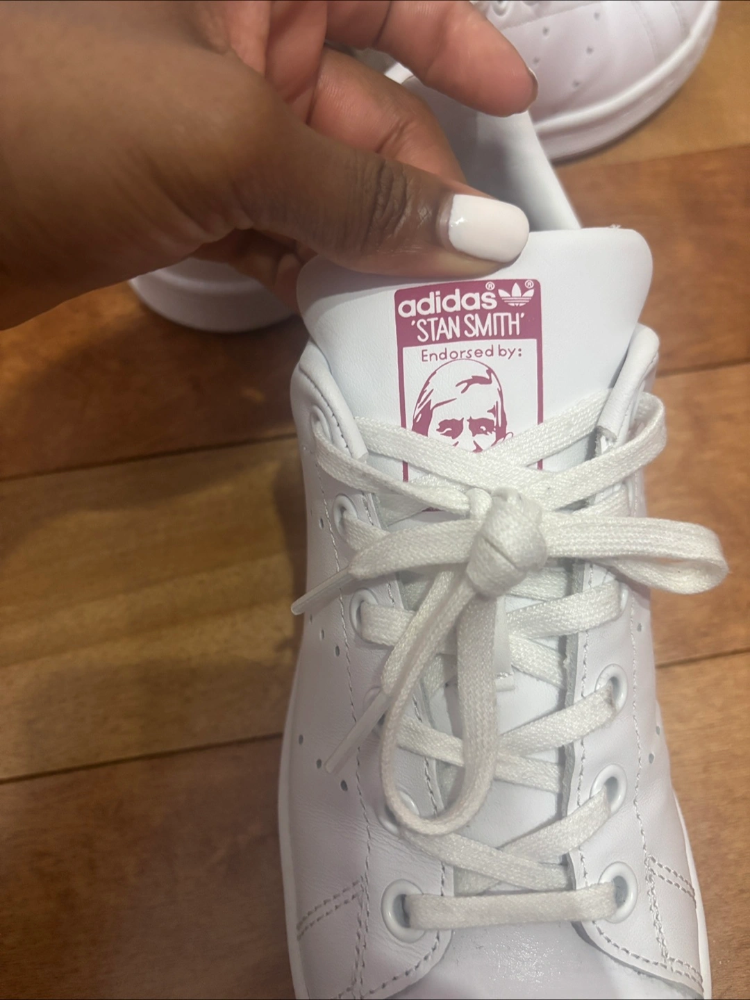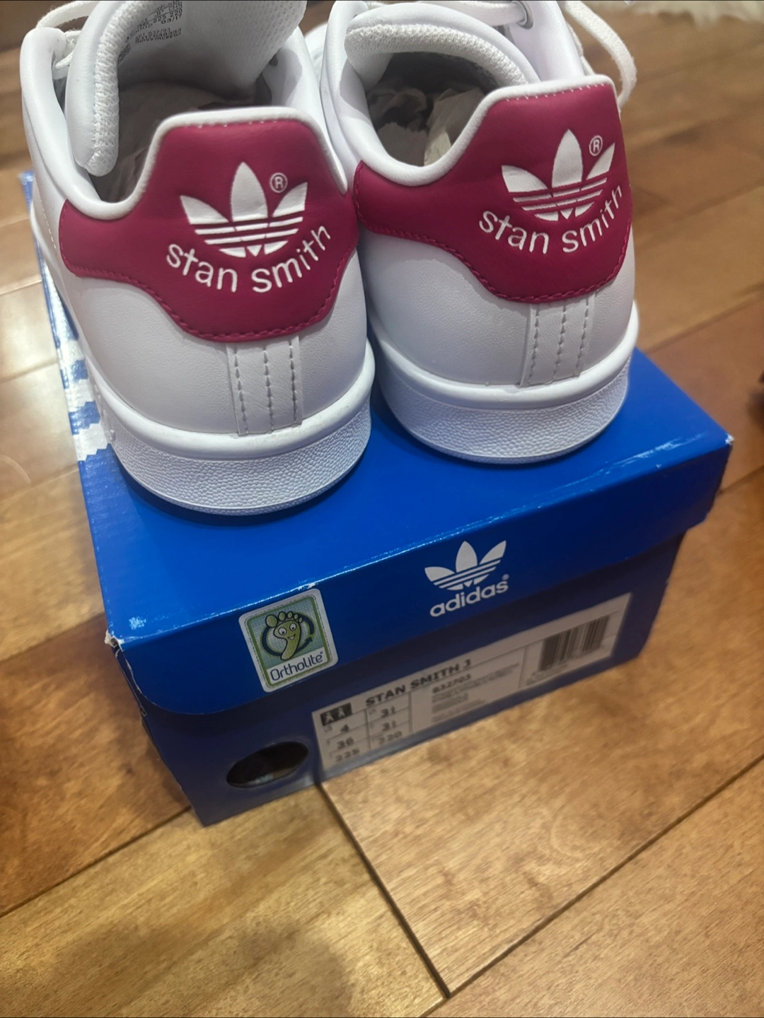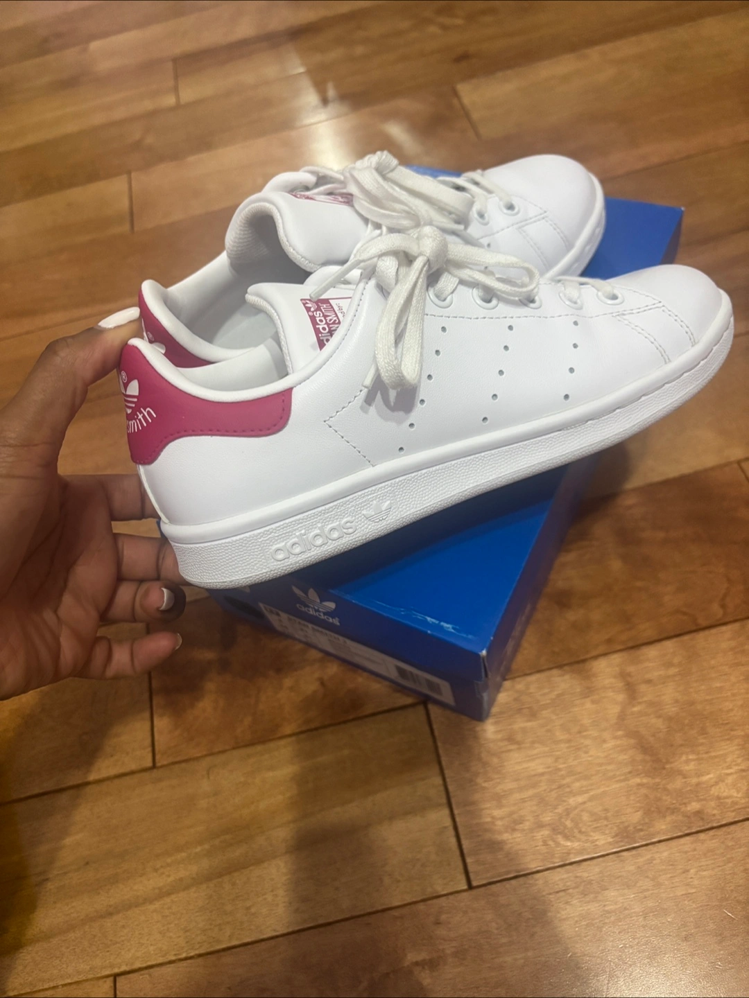 Selling a pair of Adidas Stan Smith sneakers in US size 4! These classic white sneakers feature the iconic Stan Smith design with a touch of pink on the heel and tongue logo. They come with the original box . Like new barely worn ! Soft leather still smells new :)