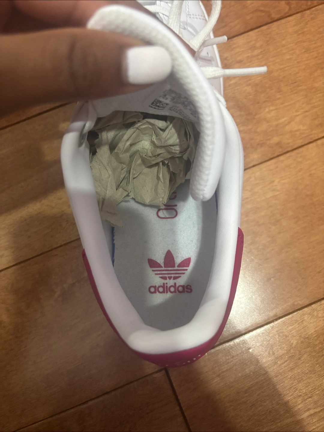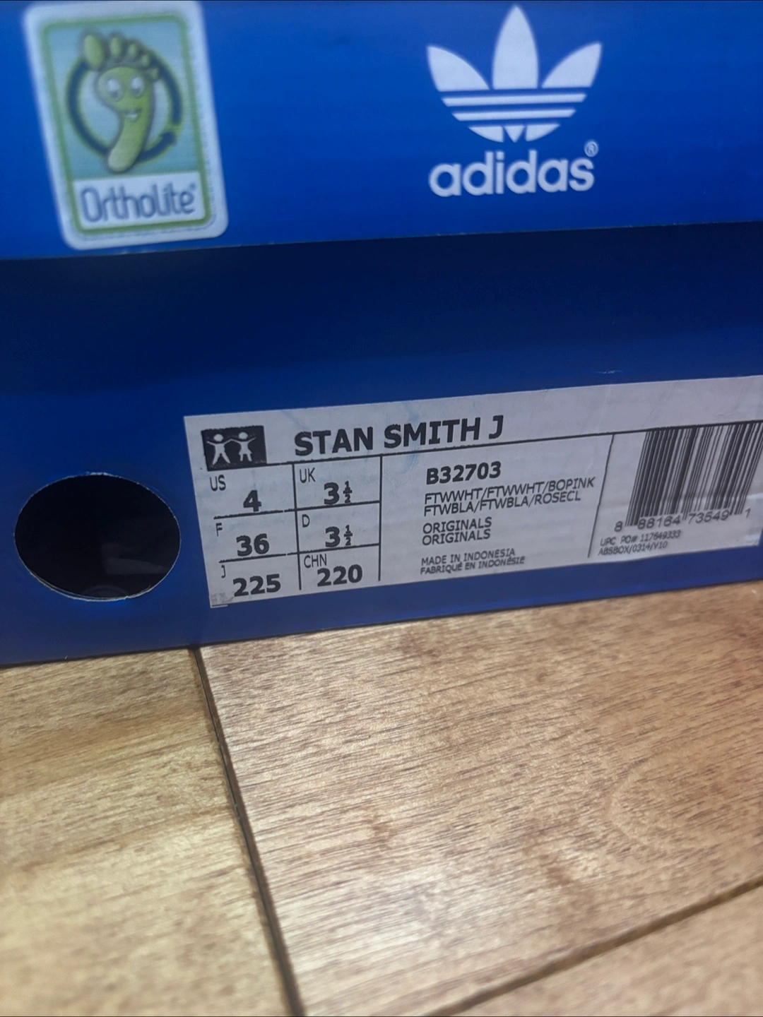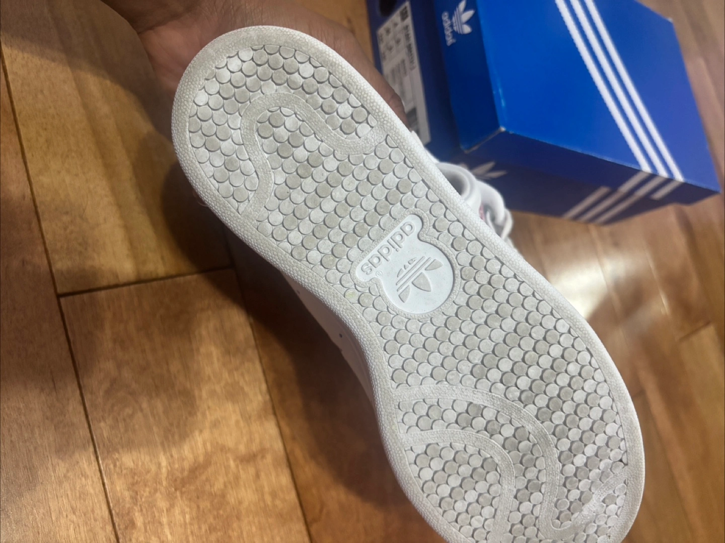 Selling a pair of Adidas Stan Smith sneakers in US size 4! These classic white sneakers feature the iconic Stan Smith design with a touch of pink on the heel and tongue logo. They come with the original box . Like new barely worn ! Soft leather still smells new :)