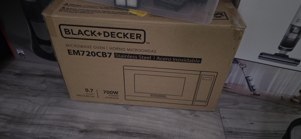 Selling a Black+Decker microwave oven, model EM720CB7. It's a stainless steel model with a 0.7 cuft capacity and 700W power. Perfect for small spaces and quick heating!