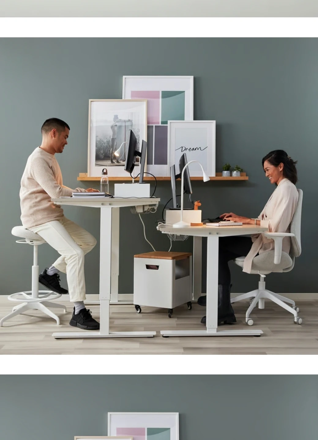 This IKEA TROTTEN desk lets you switch between sitting and standing throughout your workday. It's a beige/white sit/stand desk with a 160x80 cm tabletop.