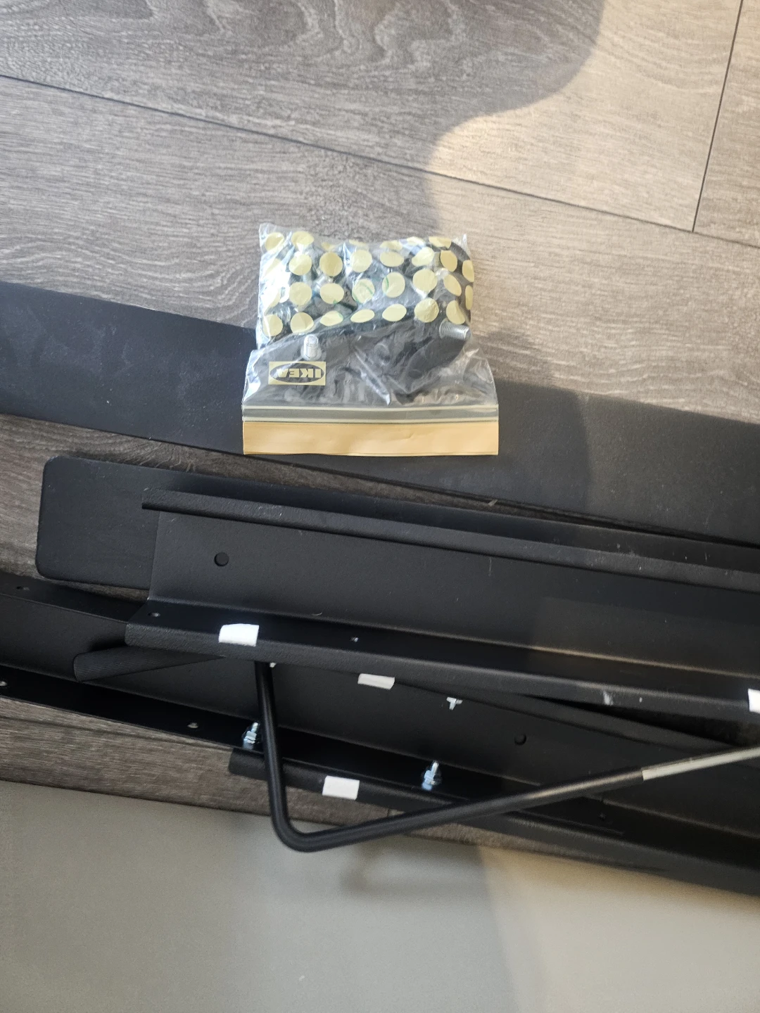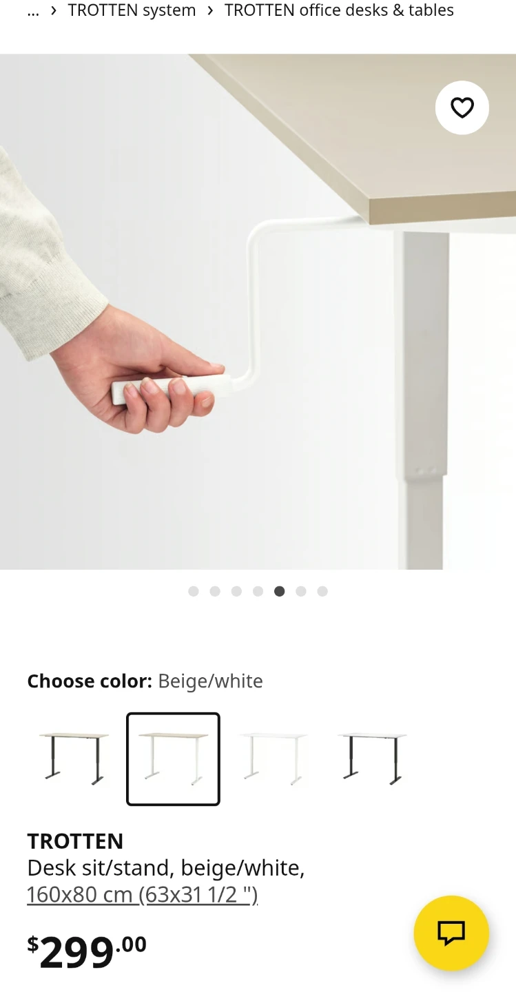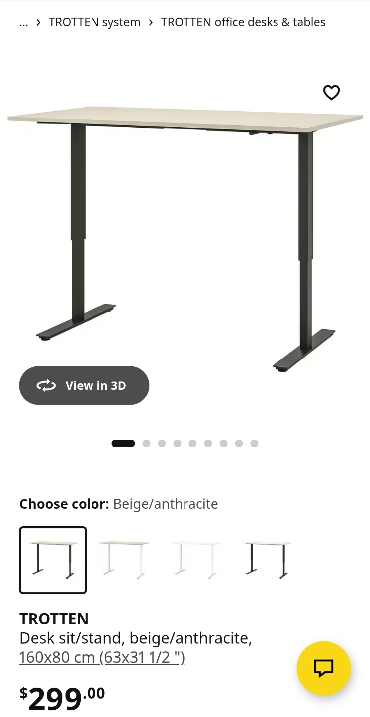 This IKEA TROTTEN desk lets you switch between sitting and standing throughout your workday. It's a beige/white sit/stand desk with a 160x80 cm tabletop.
