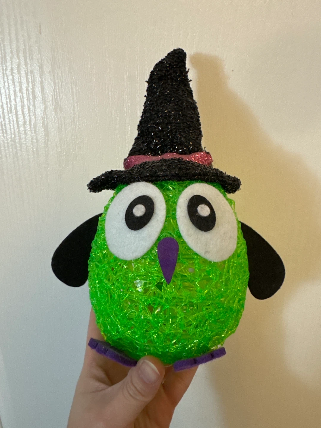 Cute green owl decoration is perfect for Halloween! It features big googly eyes and a witch hat. It lights up to add a spooky glow to your home. Requires batteries (not included).