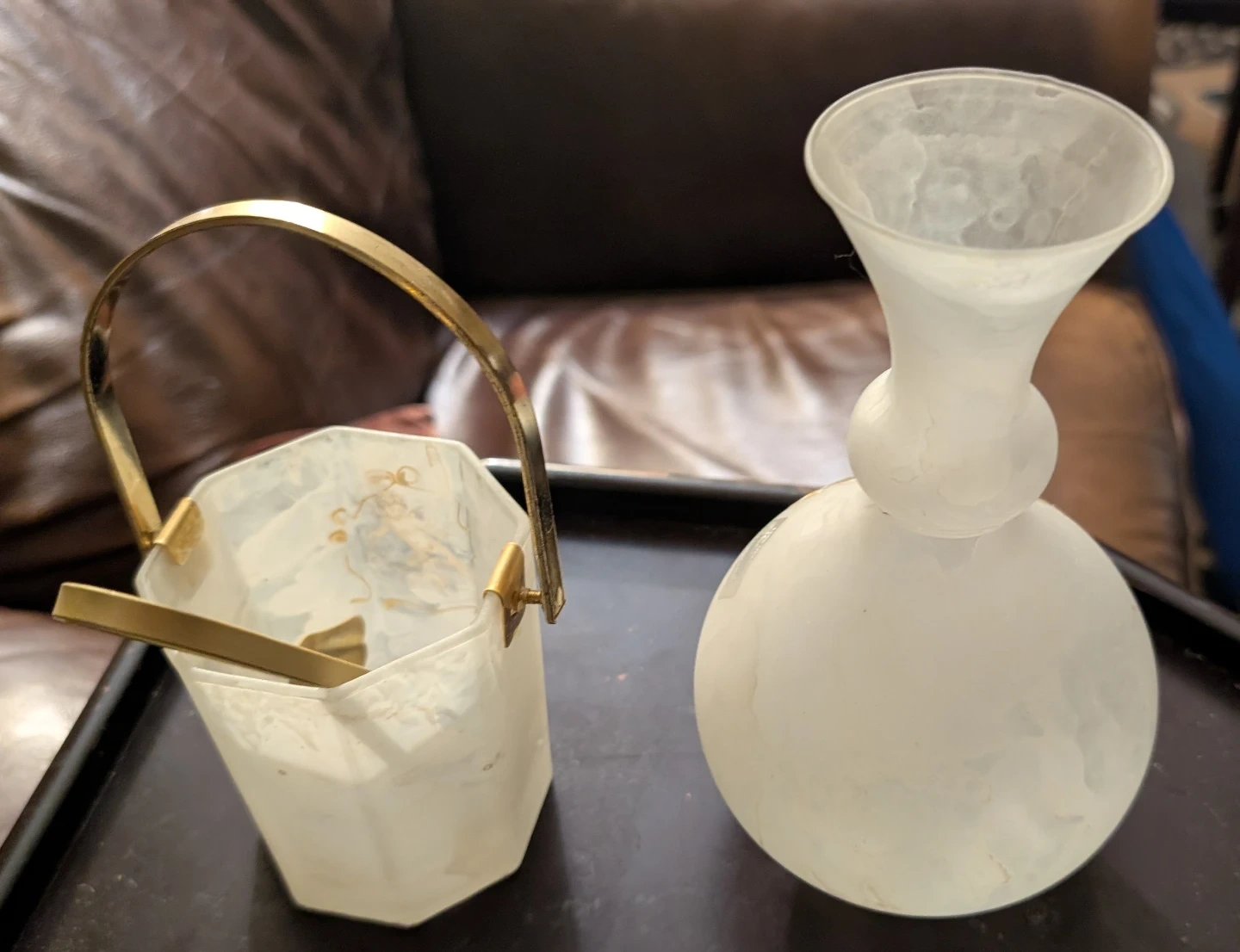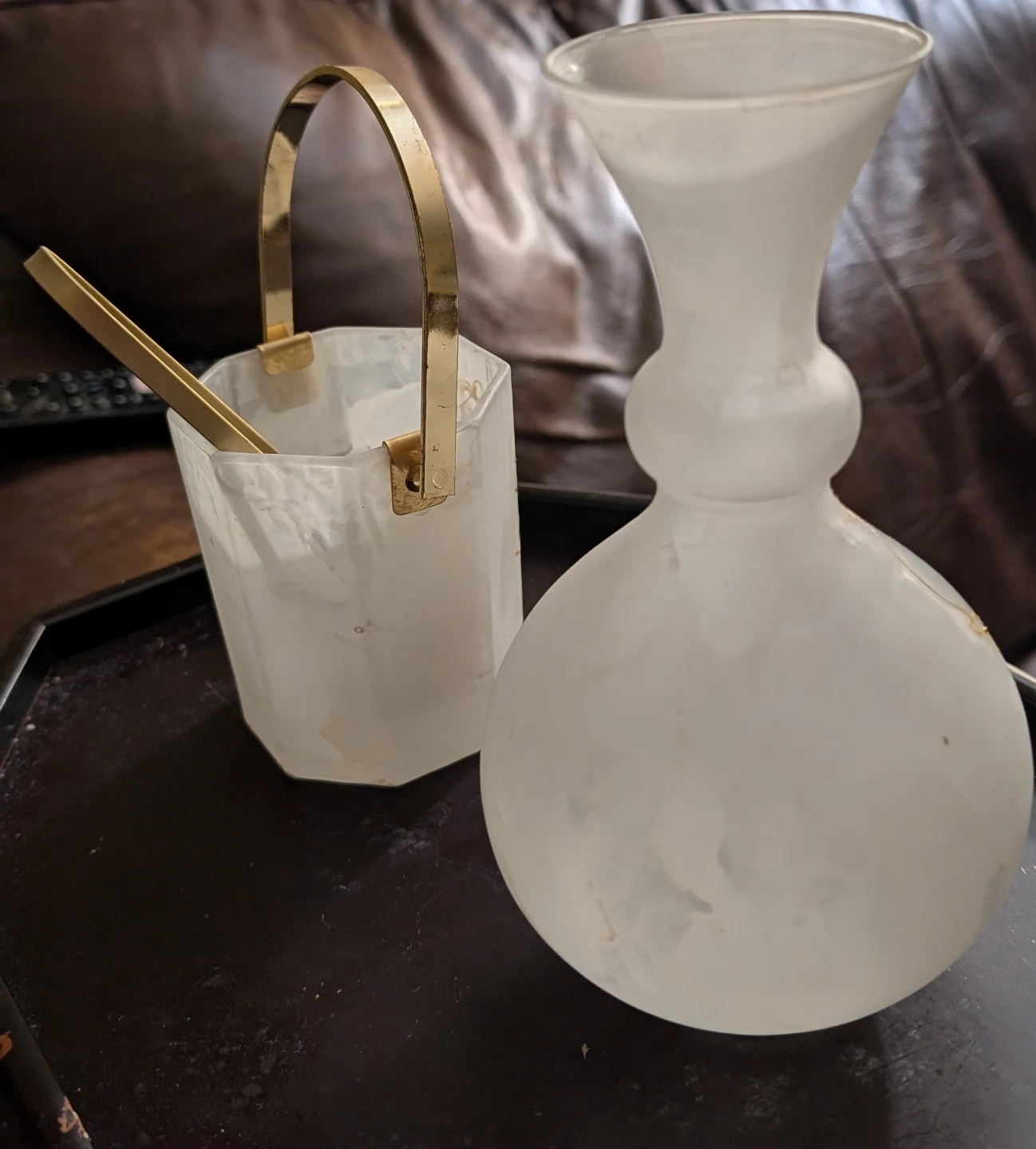 This set includes a frosted glass vase and a matching ice bucket with a gold-tone handle and tongs. The vase has a bulbous base with a narrow neck. The ice bucket is octagonal with a textured finish. It's a beautiful set for serving or decor!