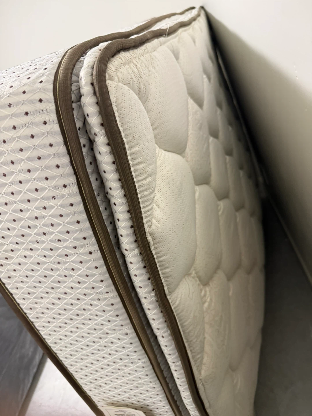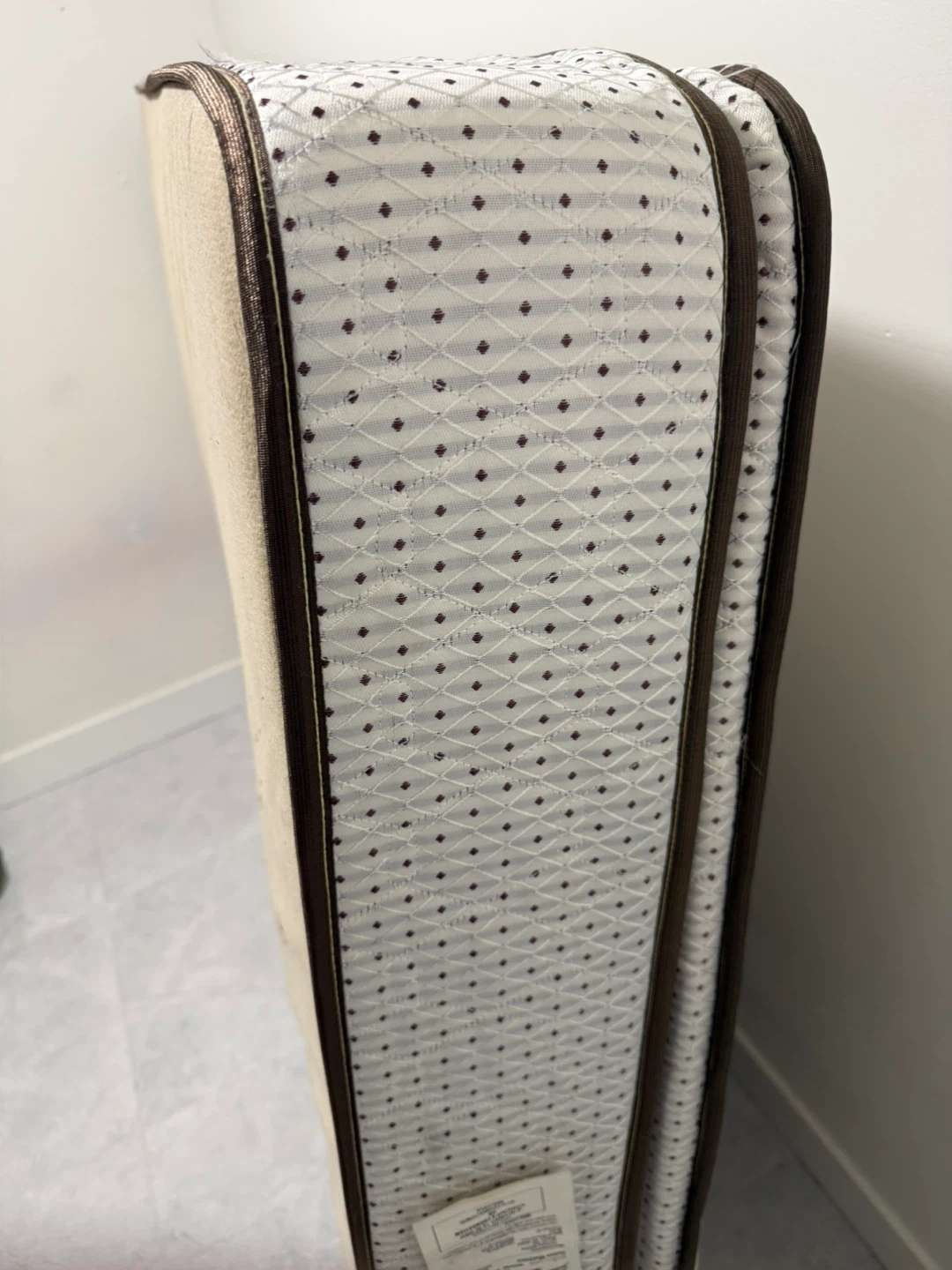 Queen size mattress and box spring set, ready for a new home. The mattress is covered in protective plastic. It's great for a student or spare room. Both pieces are included!