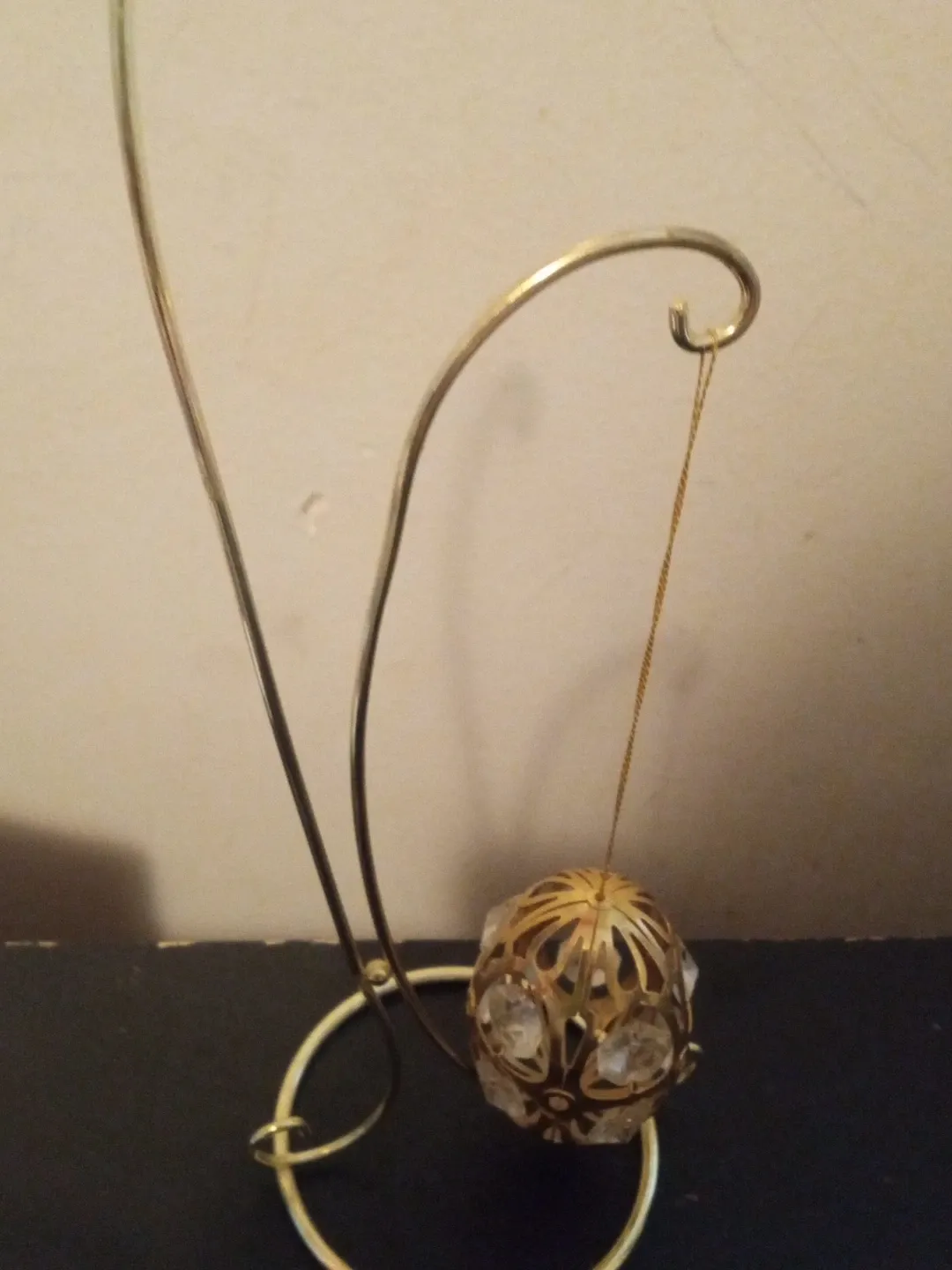 This decorative stand is gold-toned with a delicate curved arm. It holds a 24k gold plated favorite egg with clear crystal-like stones. The orb has an intricate filigree design.