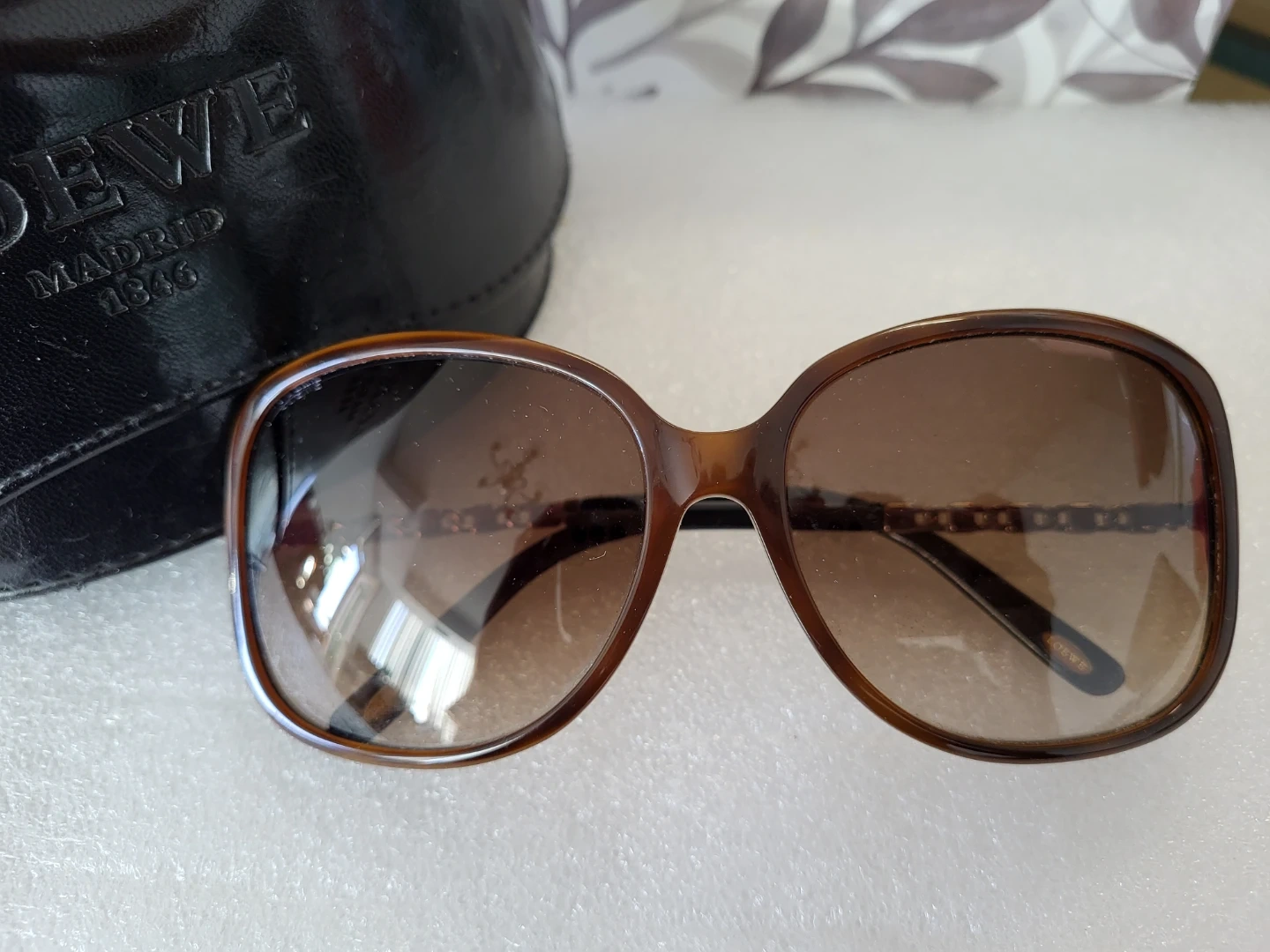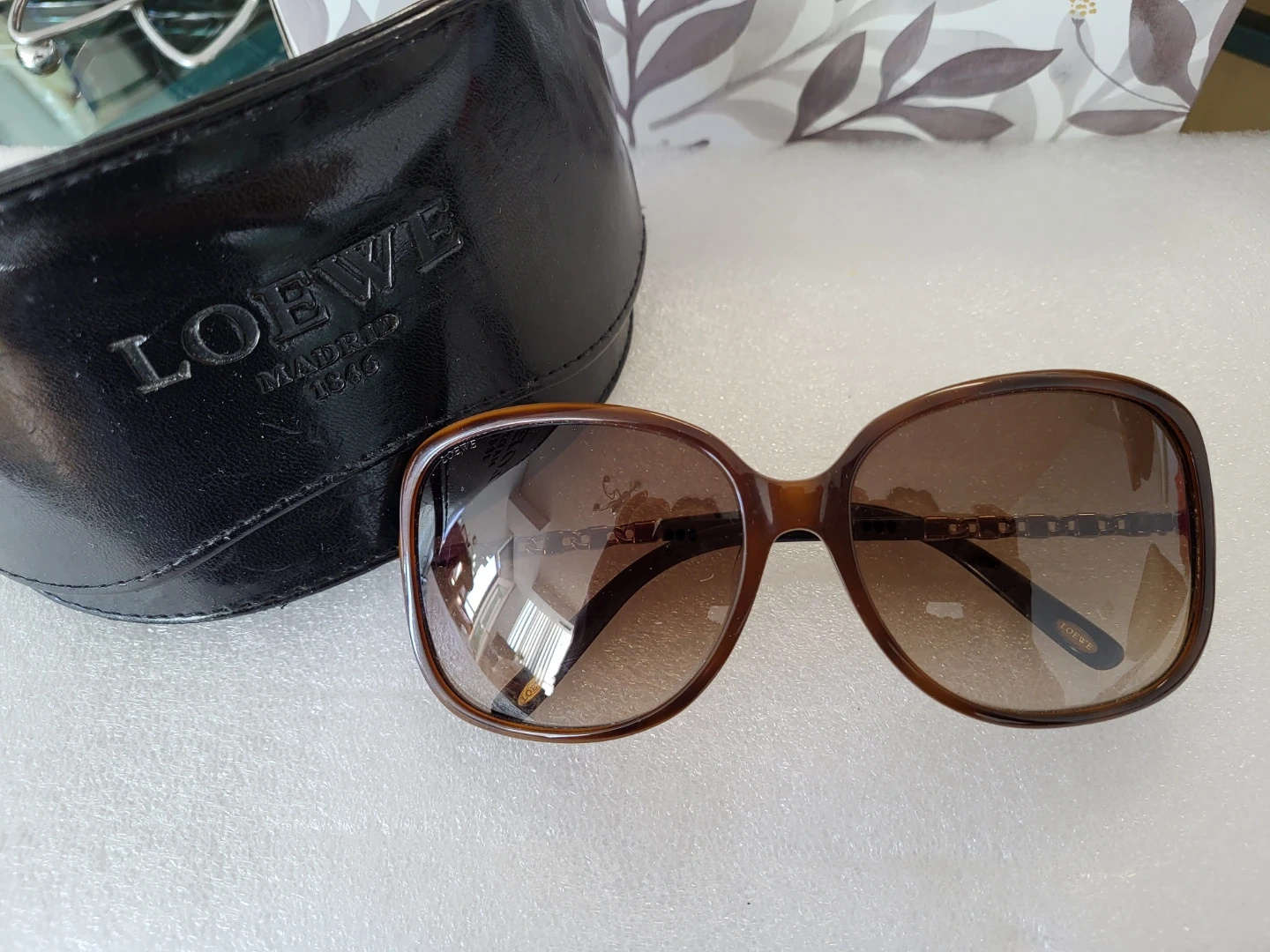 These are stylish Loewe sunglasses. They come with their original black leather case. The frames are brown tortoise shell.