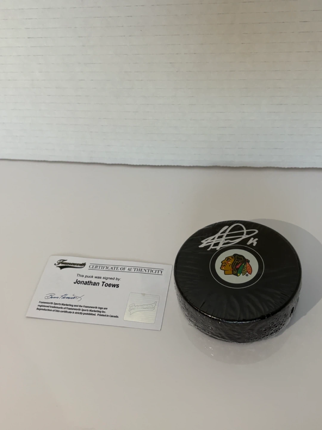 This puck was signed by Jonathan Toews. It includes a certificate of authenticity from Frameworth. Official NHL licensed product.