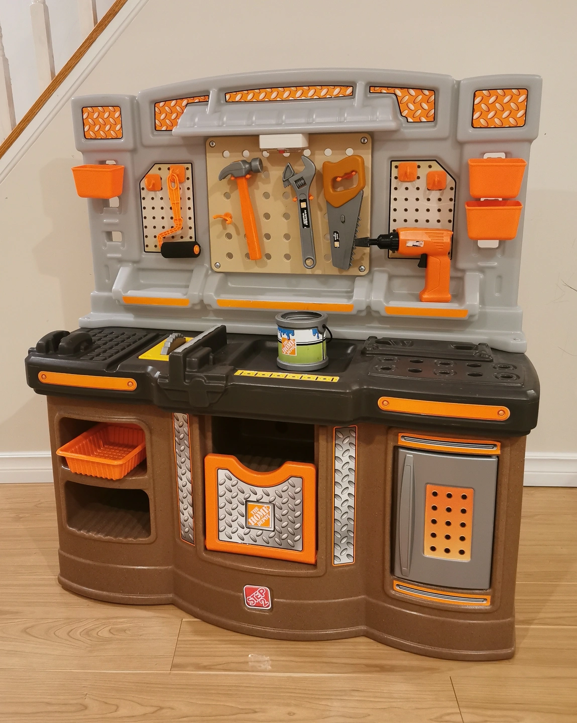 Clean up after playtime with the molded-in utility sink, and keep the pretend workbench set looking tidy by storing accessories in the storage jars, cabinets and bins, and hanging tools on the pegboard