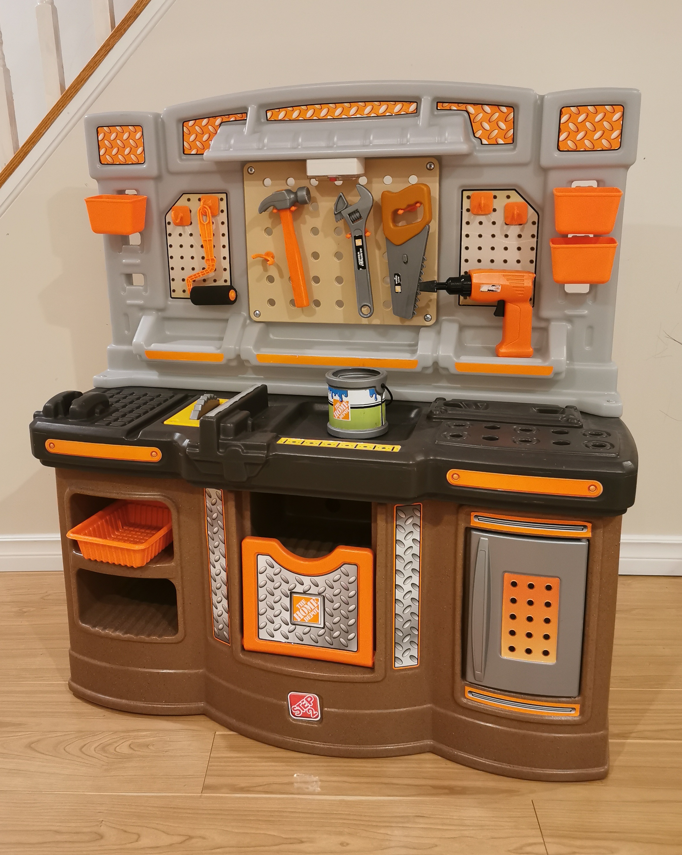 Molded-in drill and nail holes on the workbench tabletop help kids practice hand-eye coordination as they build