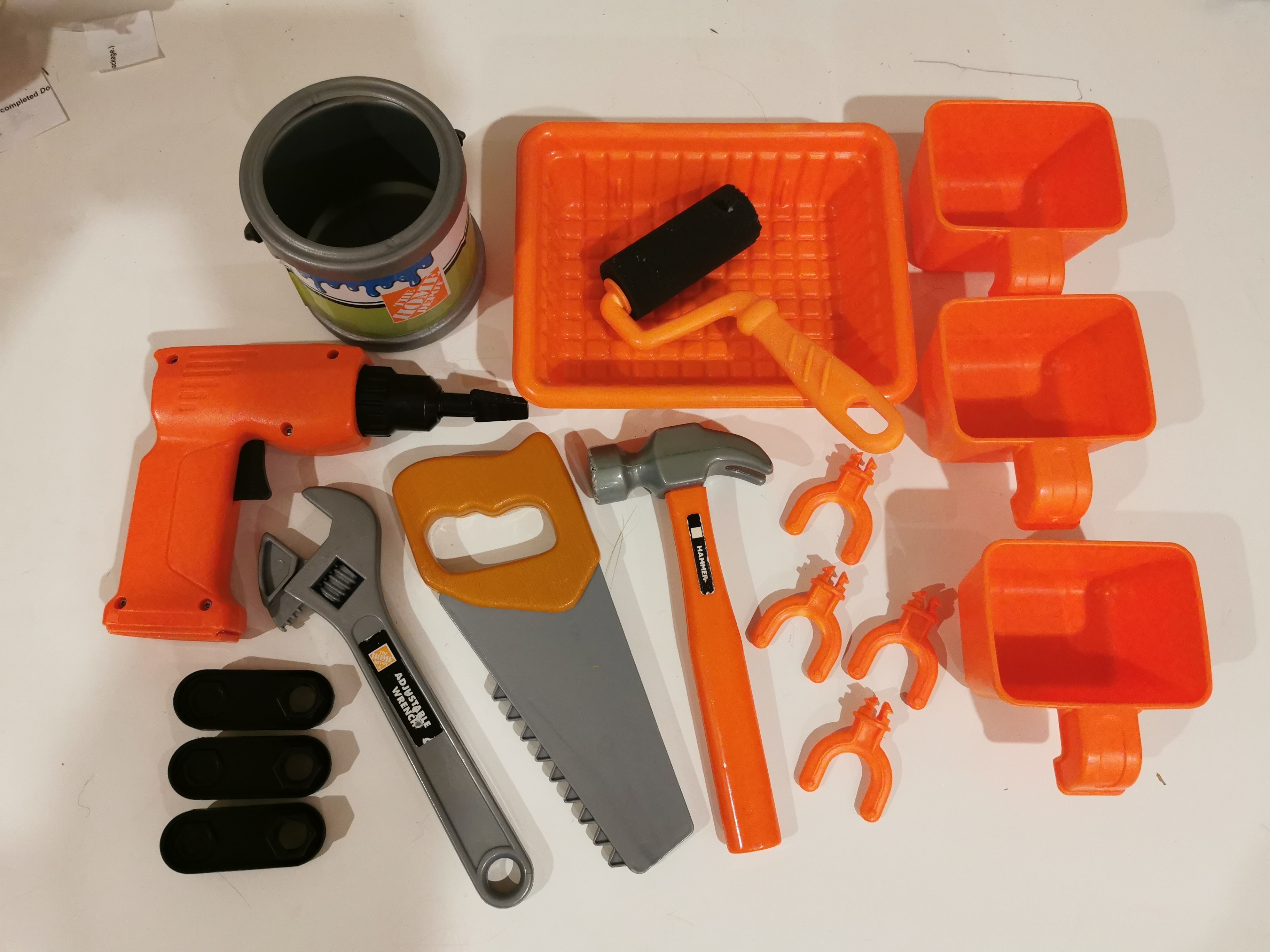 Clean up after playtime with the molded-in utility sink, and keep the pretend workbench set looking tidy by storing accessories in the storage jars, cabinets and bins, and hanging tools on the pegboard