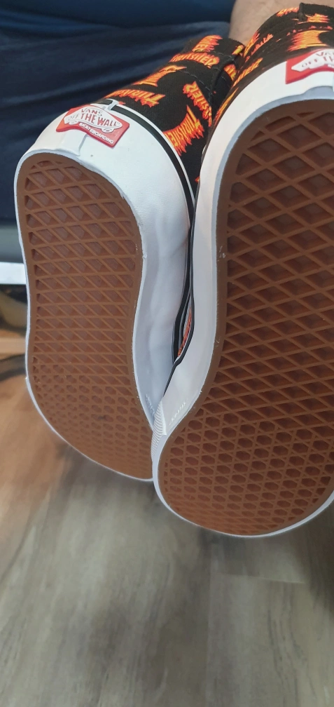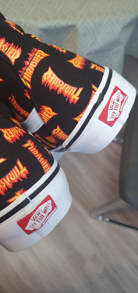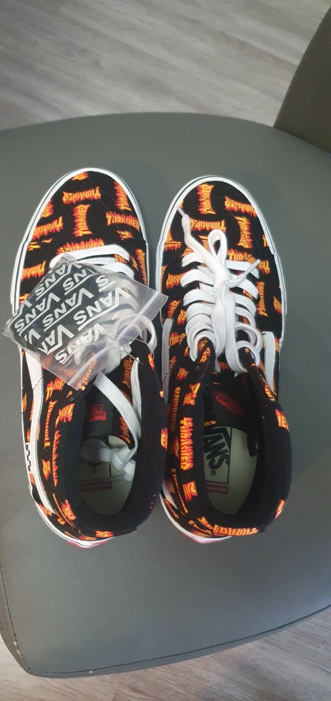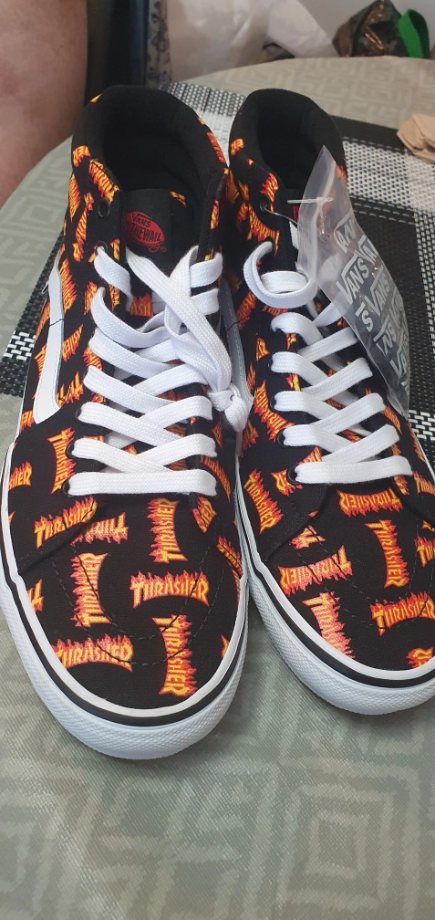 Here are a pair of Vans Sk8-Hi shoes in a collaboration with Thrasher Magazine! The classic Vans side stripe is present in white, and the shoes have a durable rubber waffle outsole for great grip and board feel. They're in great shape for hitting the skatepark!