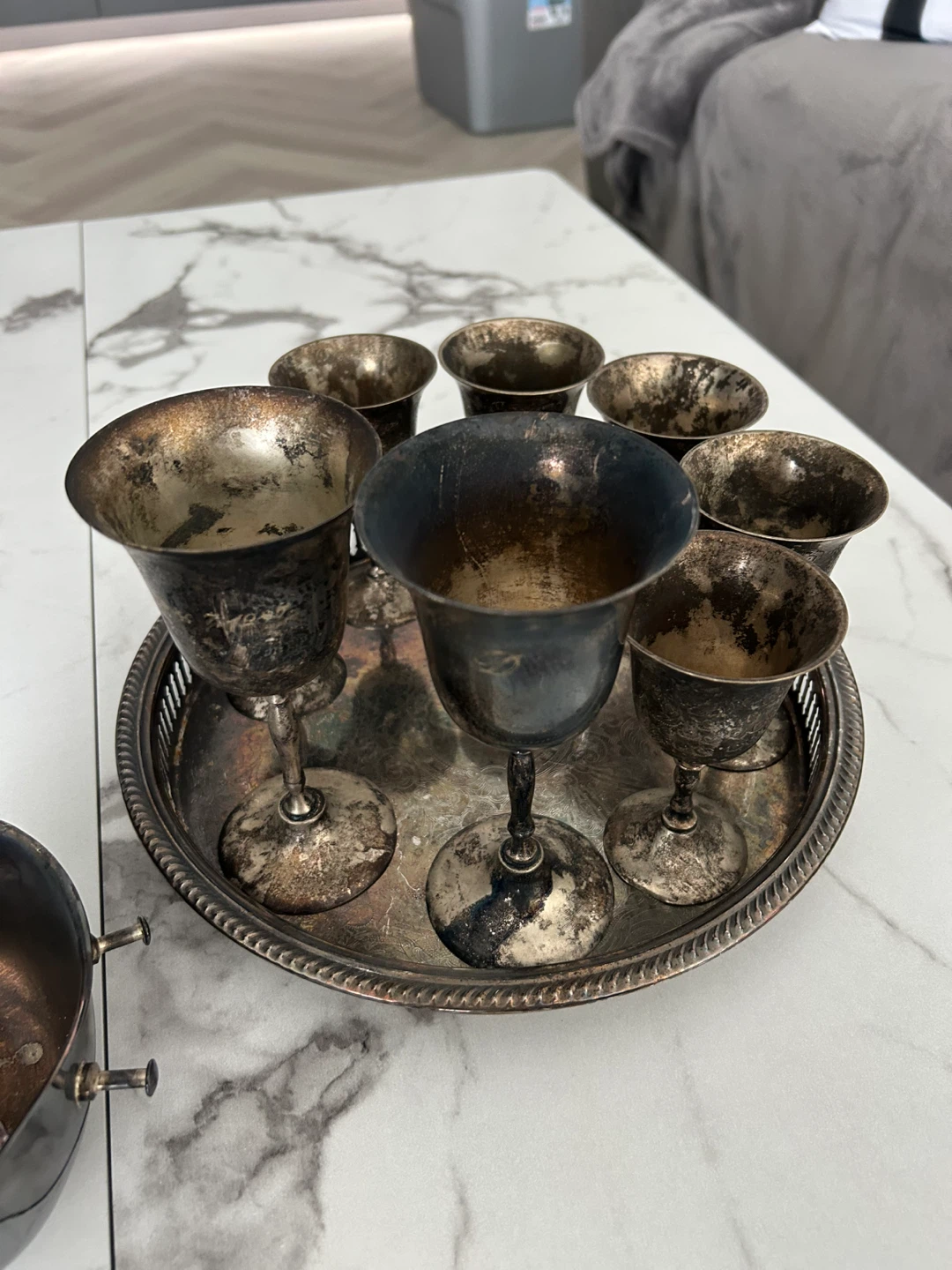 This set includes an ornate silver-plated serving dish with a matching fork, plus six silver-plated goblets on a decorative tray. It's a charming addition for serving drinks or small bites.