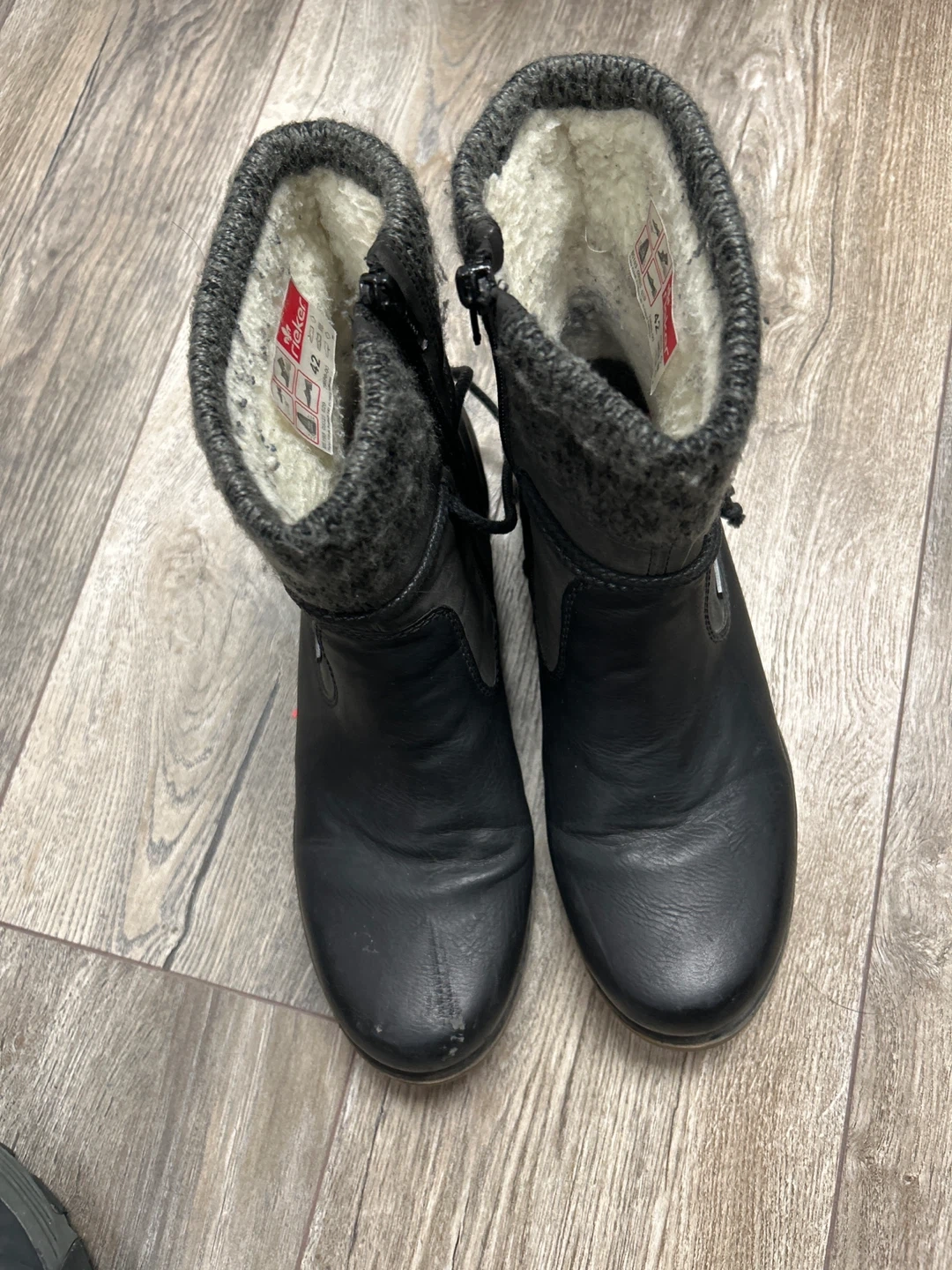 These Rieker boots are designed for warmth and comfort. They feature a durable black leather exterior with a cozy, insulated lining. The side zipper makes them easy to put on and take off.