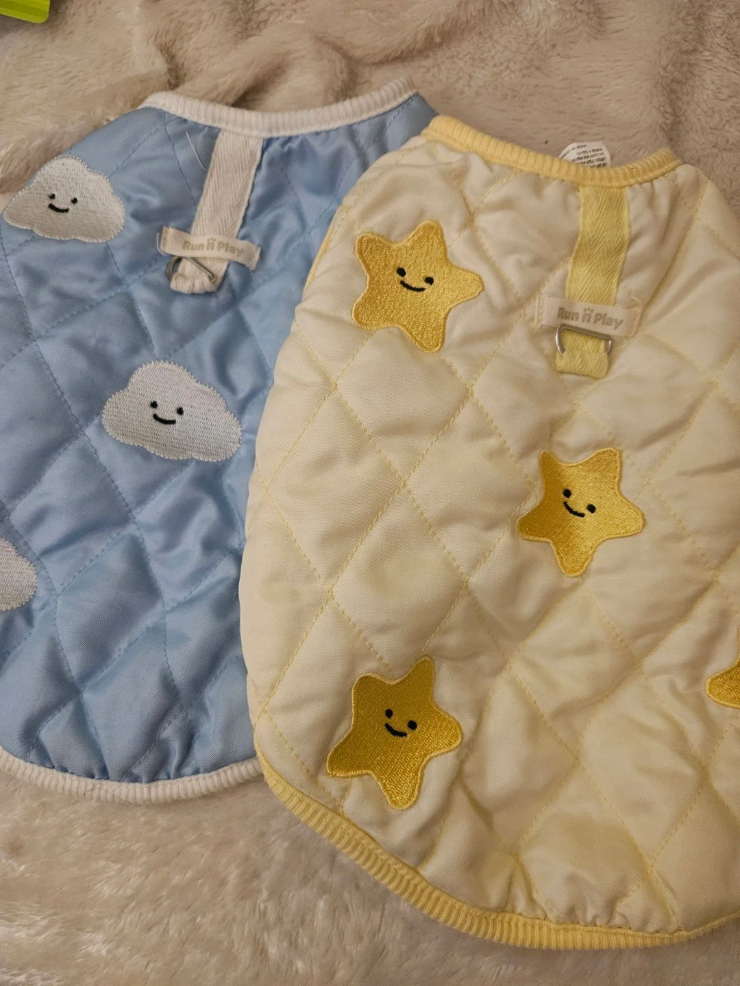 Keep your furry friend cozy with these adorable Run n Play puffer vests! One is a cute cloud design and the other has happy stars. Perfect for those chilly walks