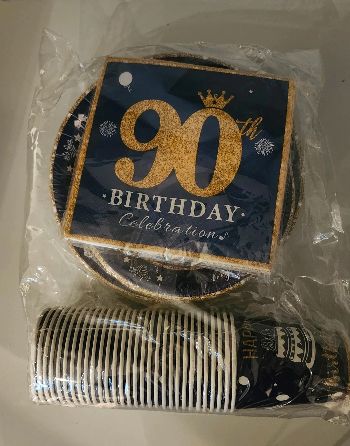 This set includes paper plates, cups, and napkins, all designed for a 90th birthday celebration. The items feature a navy blue and gold colour scheme with "90th Birthday Celebration" text and decorative elements. It's perfect for serving guests at a milestone birthday party!