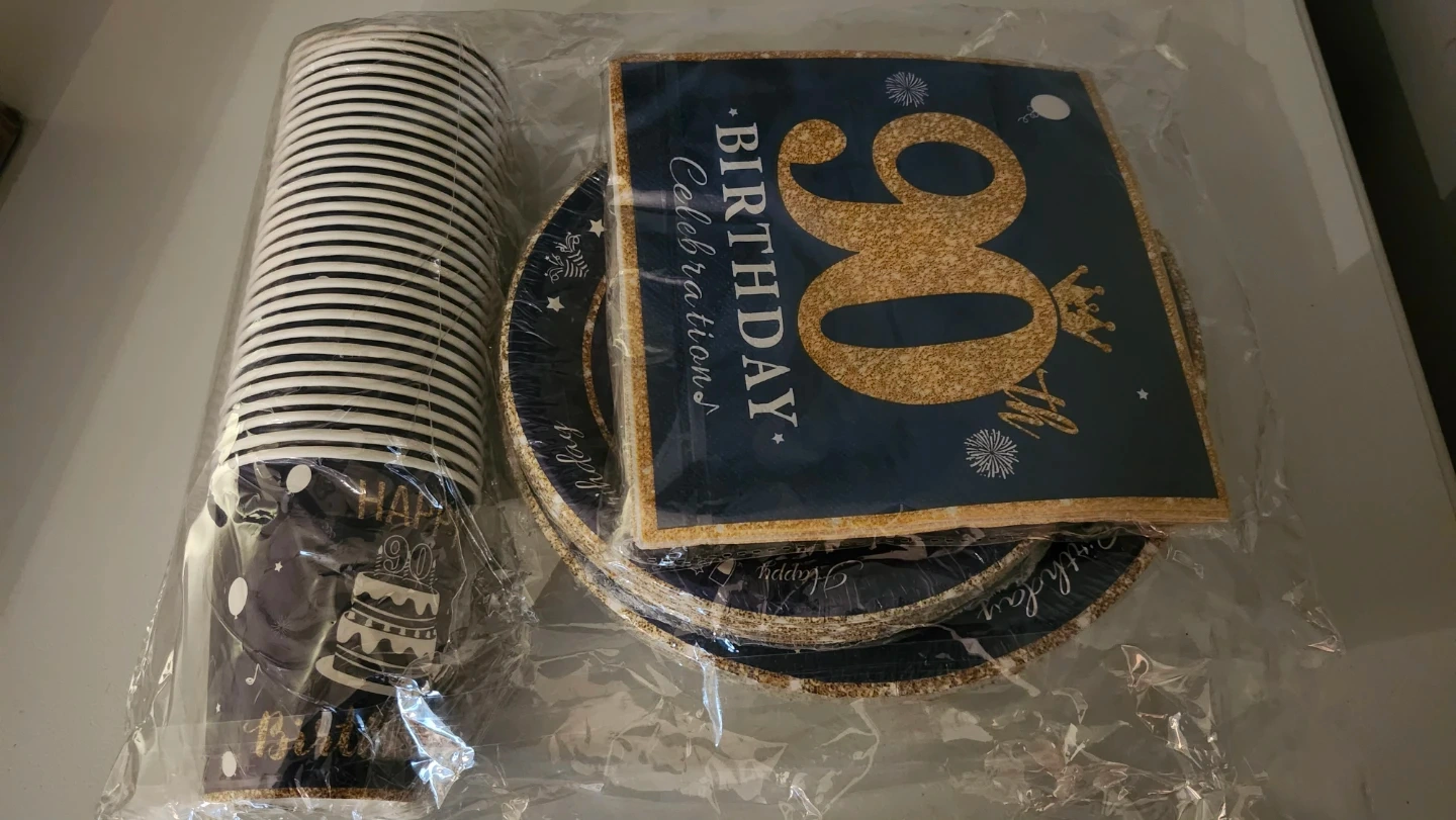 90th Birthday Celebration Paper Plates, Cups, and Napkins Set