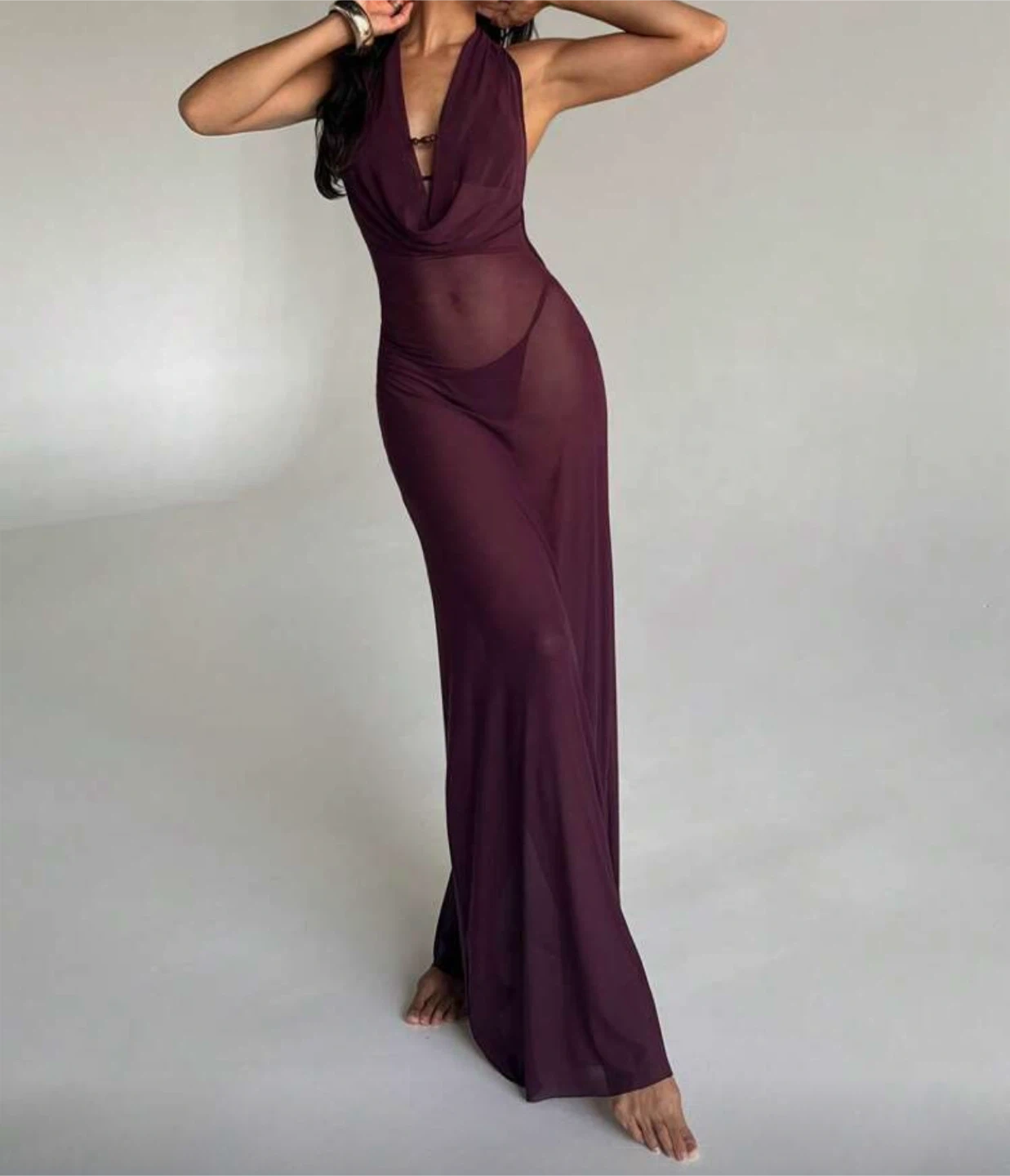 Never worn. A sheer, plum-coloured halter neck maxi dress. It features a cowl neckline and a flowy silhouette. This dress is perfect for layering over swimwear or for a beach-inspired evening look. Originally from Shein, Aloruh.