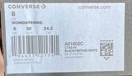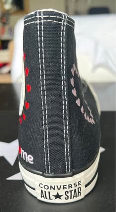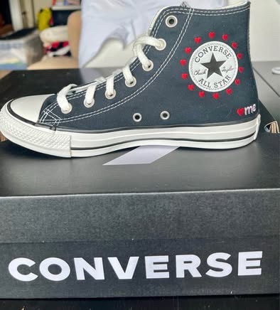New Converse Chuck Taylor All Star High Top sneakers in a women's size 8. The classic black canvas is decorated with embroidered hearts. These shoes come in their original box and have never been worn.