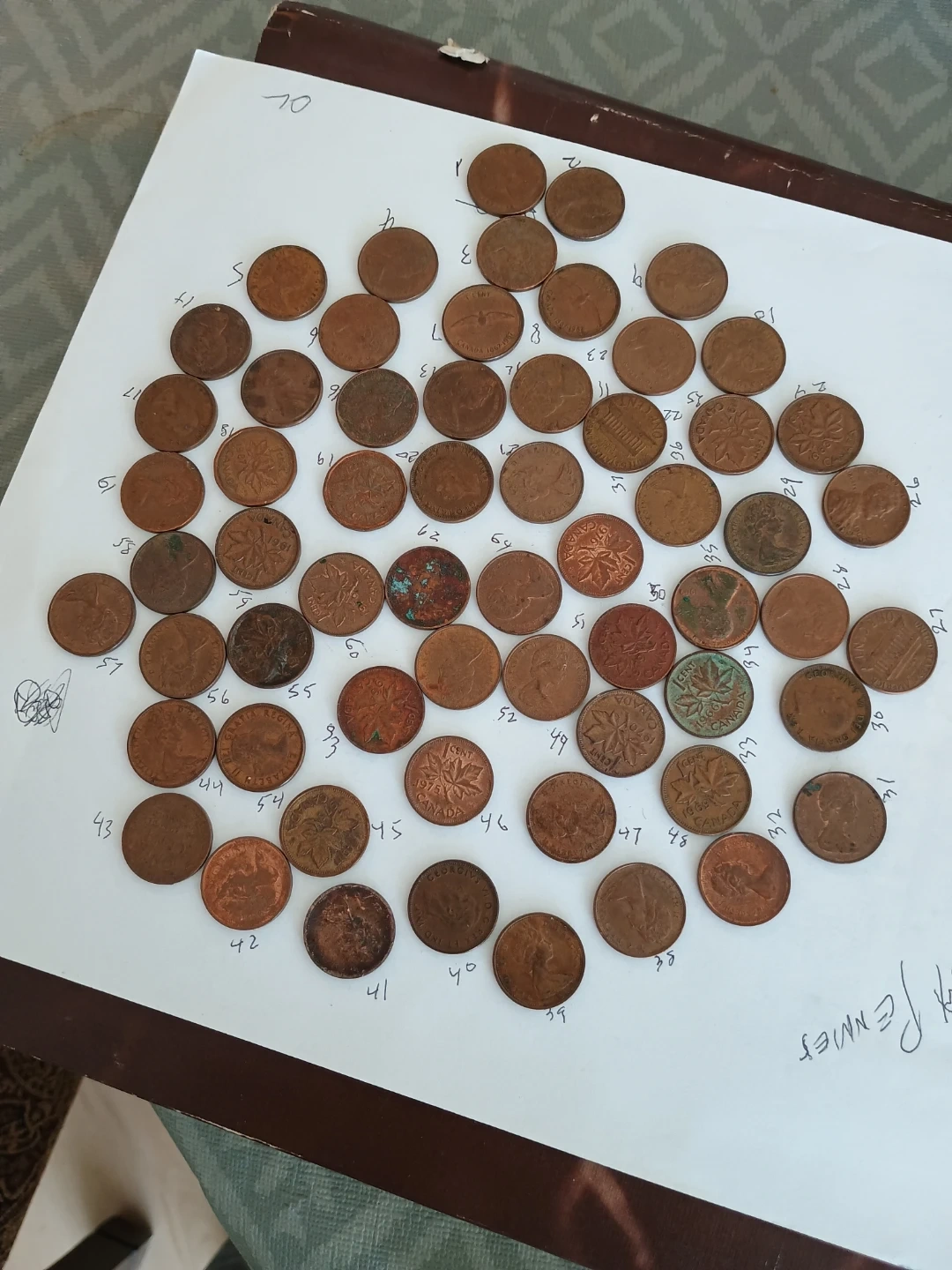 Collection of 61 Canadian pennies, varying in year. These coins are great for starting a collection or for educational purposes. They are copper-coloured.