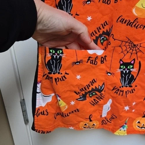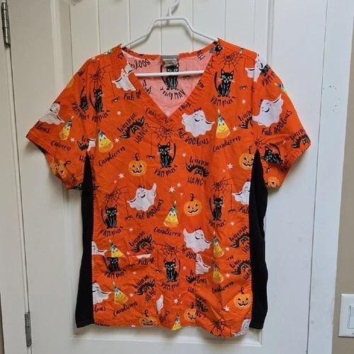 Bright orange scrub top with playful Halloween prints. Features black cats, ghosts, and pumpkins. Ideal for festive occasions. EUCTwo PocketsPlus size XXL Approximate measurements when hangingPit to pit 25 inBack middle length 26 in