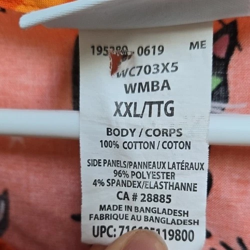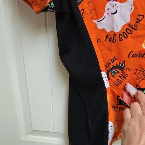 Bright orange scrub top with playful Halloween prints. Features black cats, ghosts, and pumpkins. Ideal for festive occasions. EUCTwo PocketsPlus size XXL Approximate measurements when hangingPit to pit 25 inBack middle length 26 in