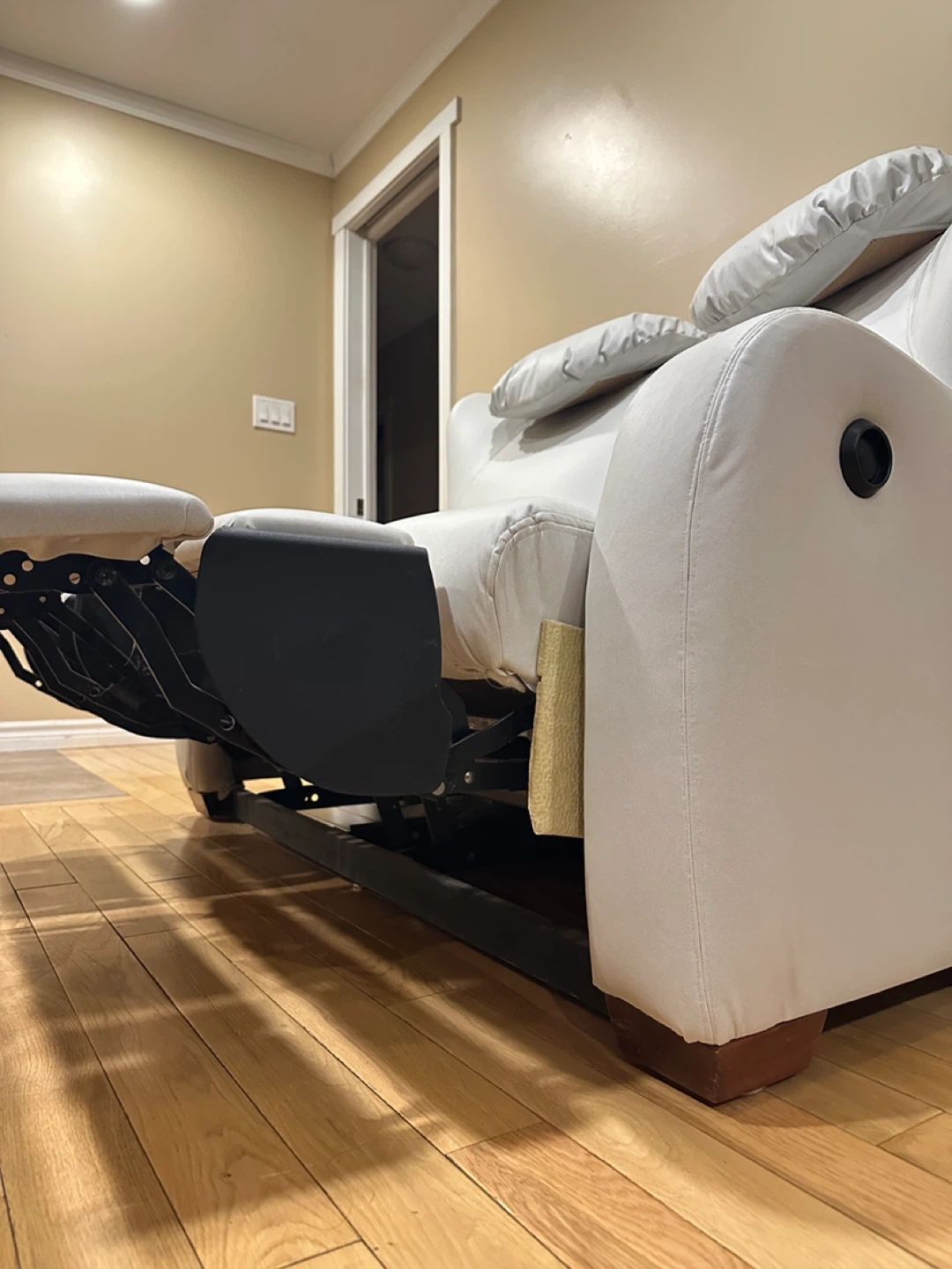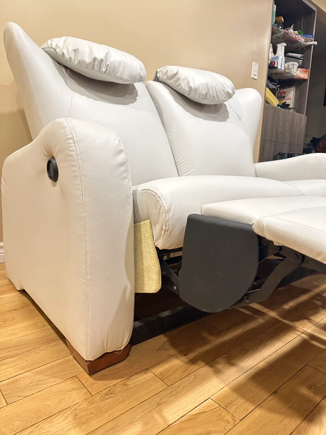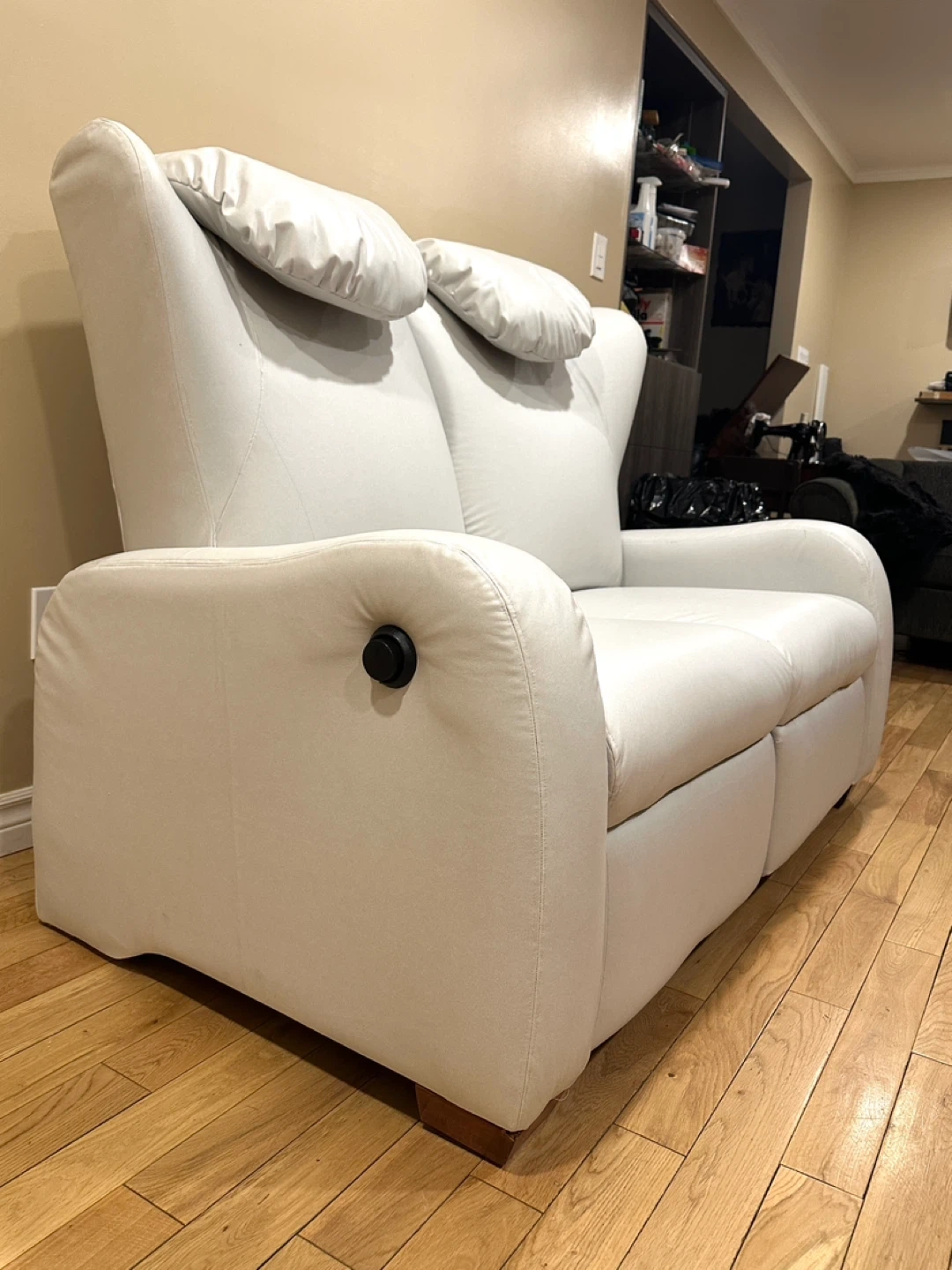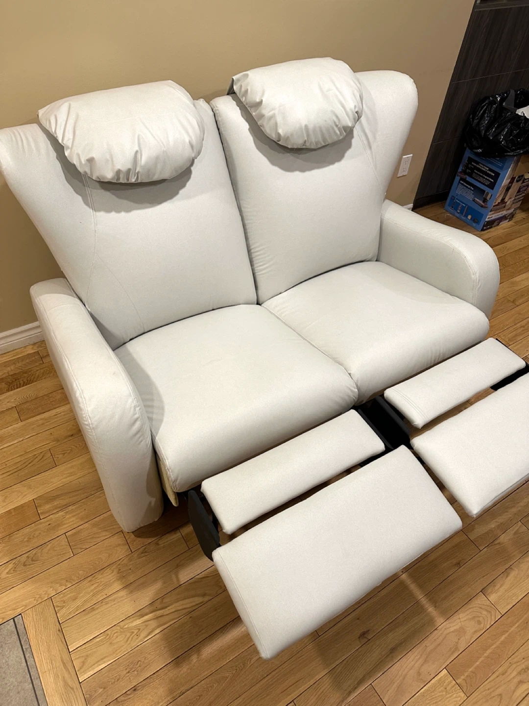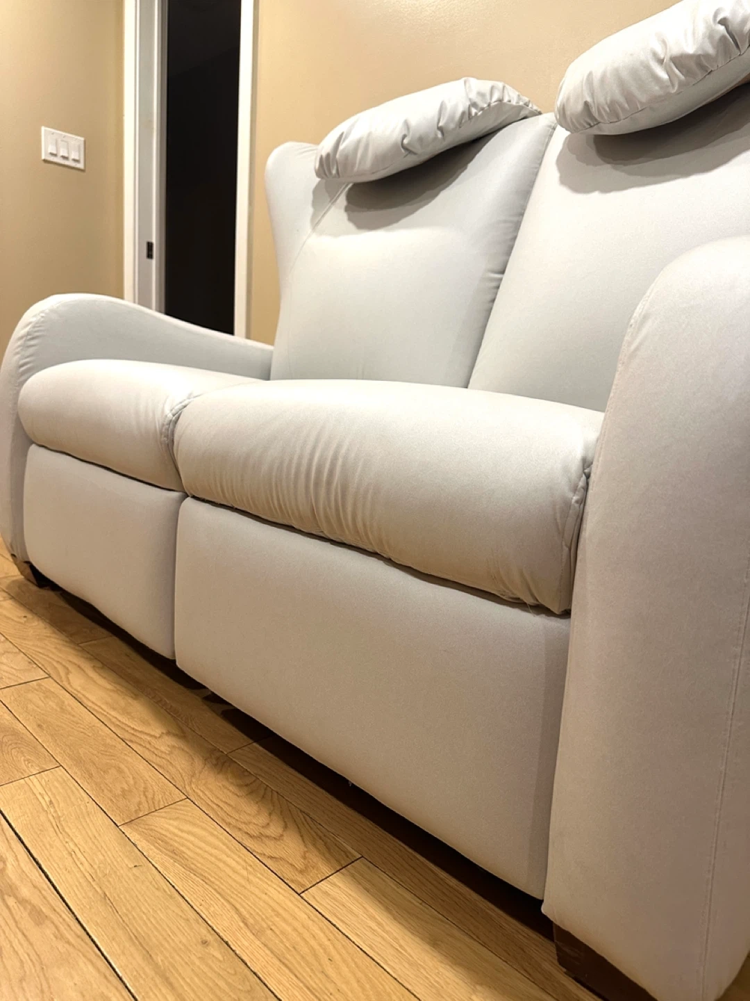 Comfortable and modern reclining loveseat in a soft light grey color. Both seats recline independently and work perfectly.