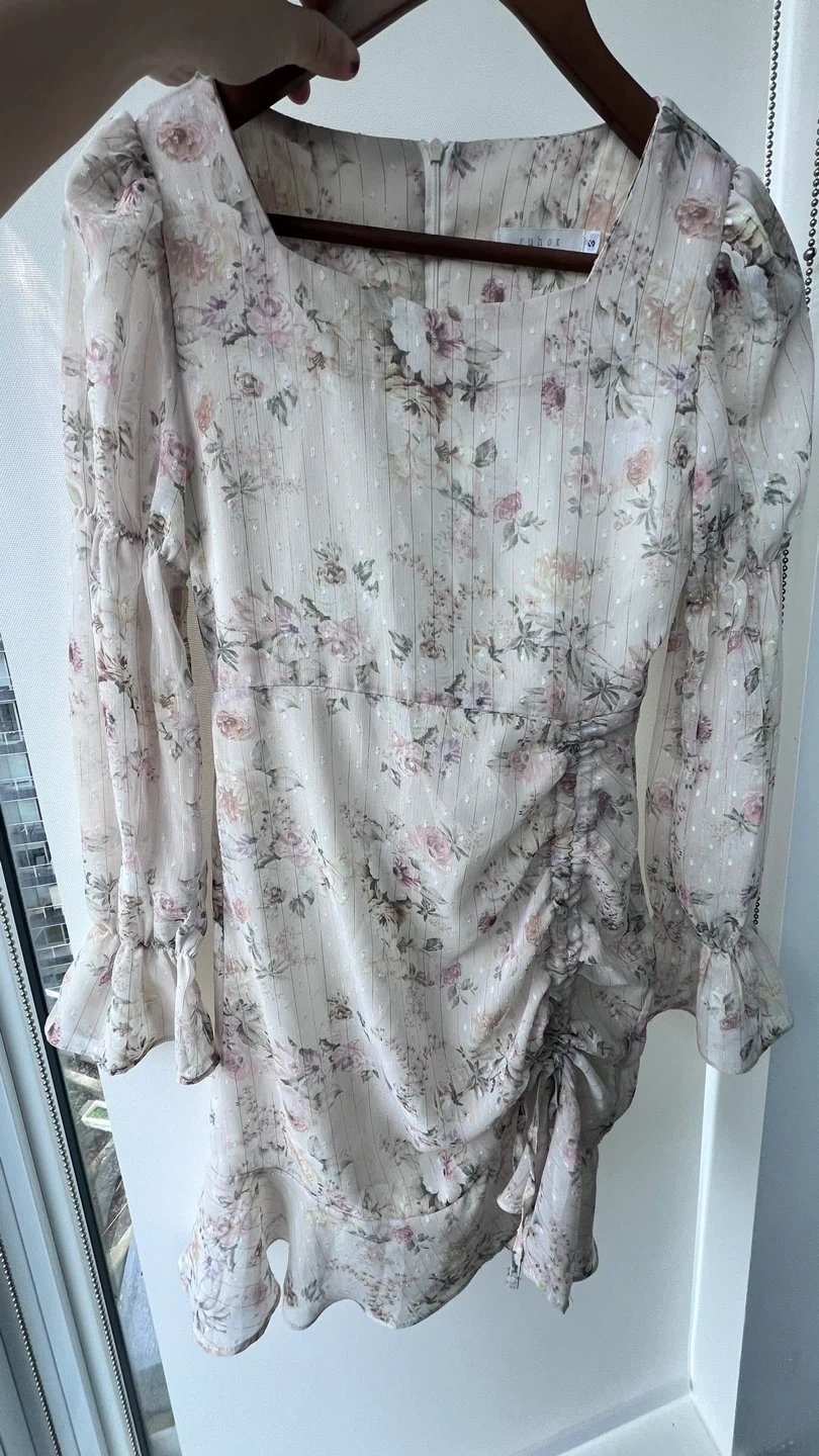 This RUHOR dress features a lovely floral print with delicate stripes and subtle shimmer. It has a flattering ruched detail on the side and ruffled cuffs. Material is lightweight chiffon.