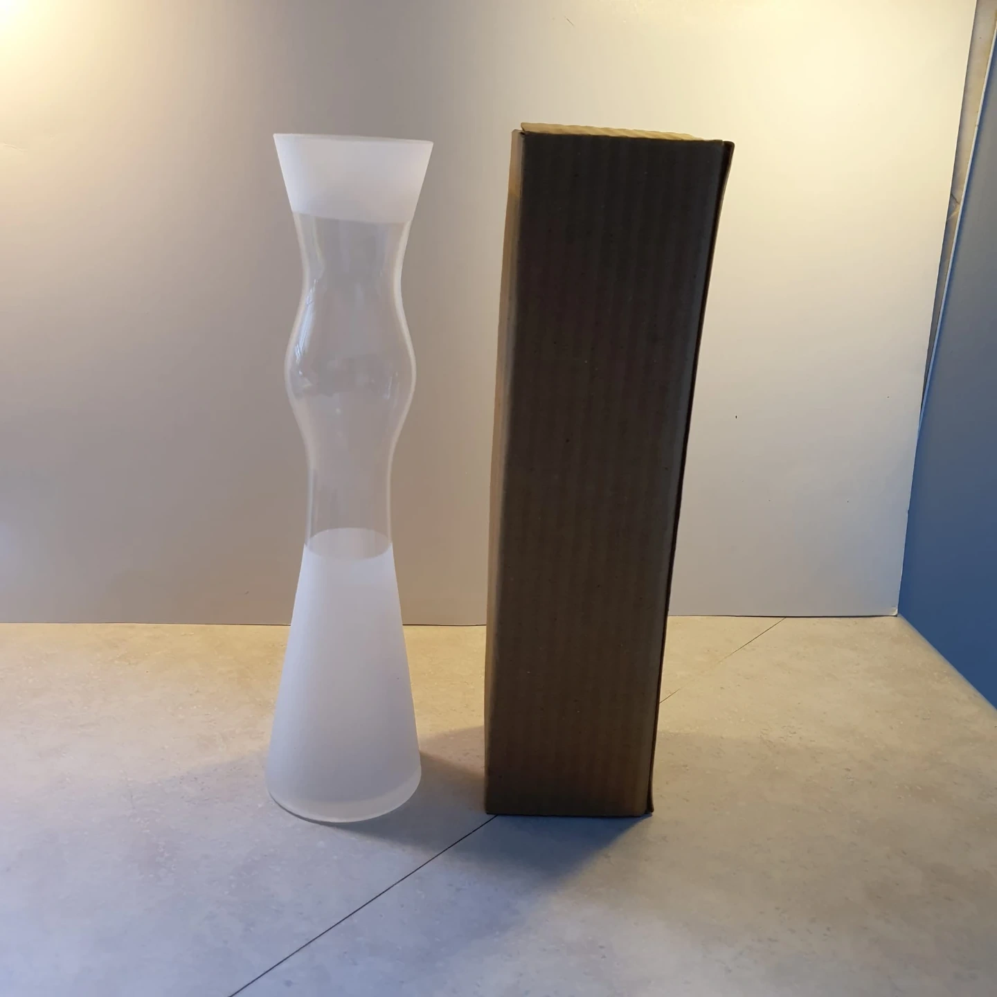 A tall, frosted glass vase with a unique hourglass shape. It stands about 14 inches tall. Comes with its original box.