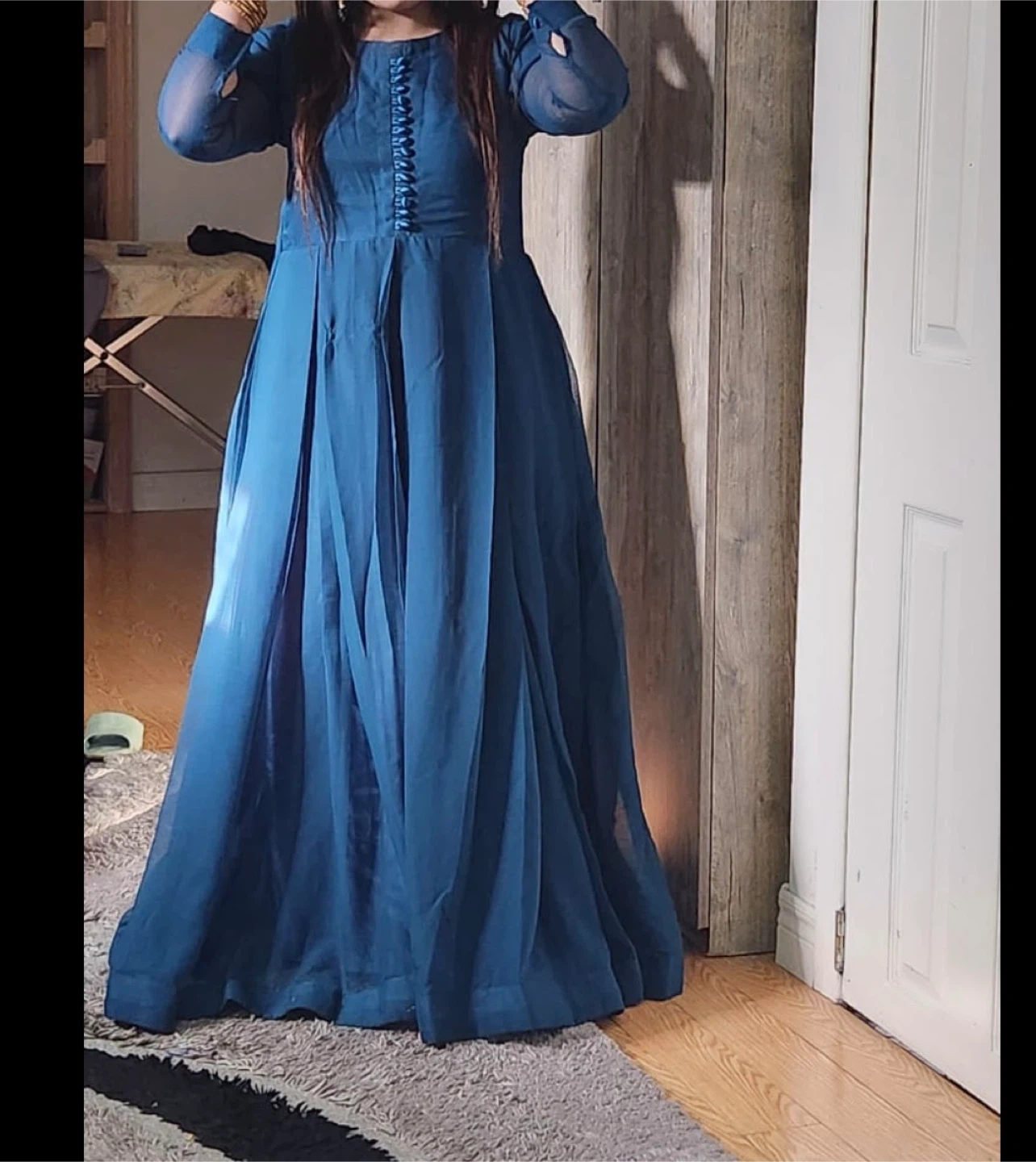 Beautiful embroidered Anarkali style dress. Features a long, flowing skirt with intricate detailing and sheer sleeves. Perfect for special occasions and celebrations!