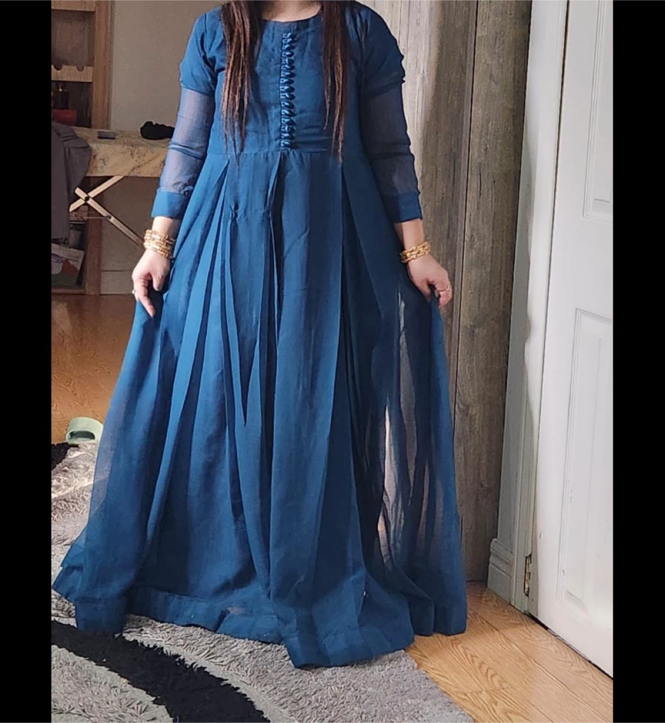 Beautiful embroidered Anarkali style dress. Features a long, flowing skirt with intricate detailing and sheer sleeves. Perfect for special occasions and celebrations!