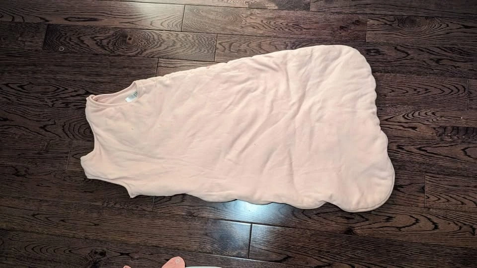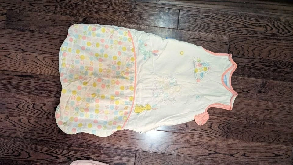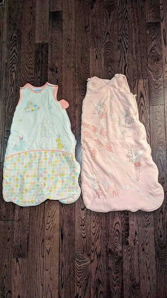 Two sleep sacks, Gro and George brands, 2.5 TOG. White and pink is 0-6 months. Pink Tinkerbell is 12-18 months. Selling $10 each.