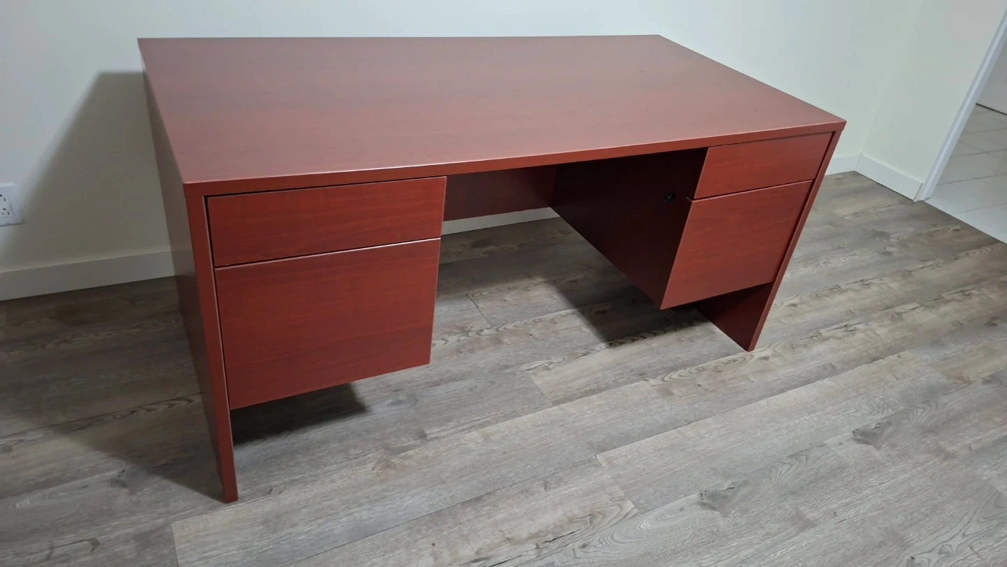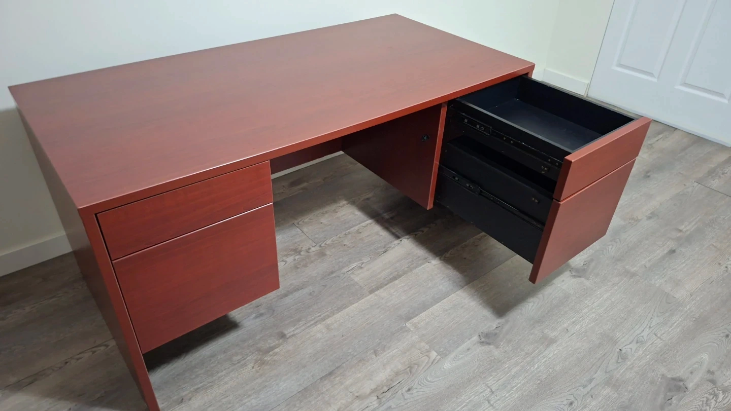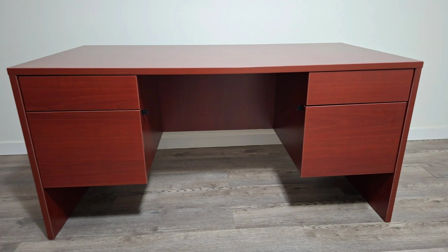 This is a cherry finish desk with drawers. It has a main work surface and two drawer units on either side. Drawer interiors are black. Drawers fully functional with locks and keys.