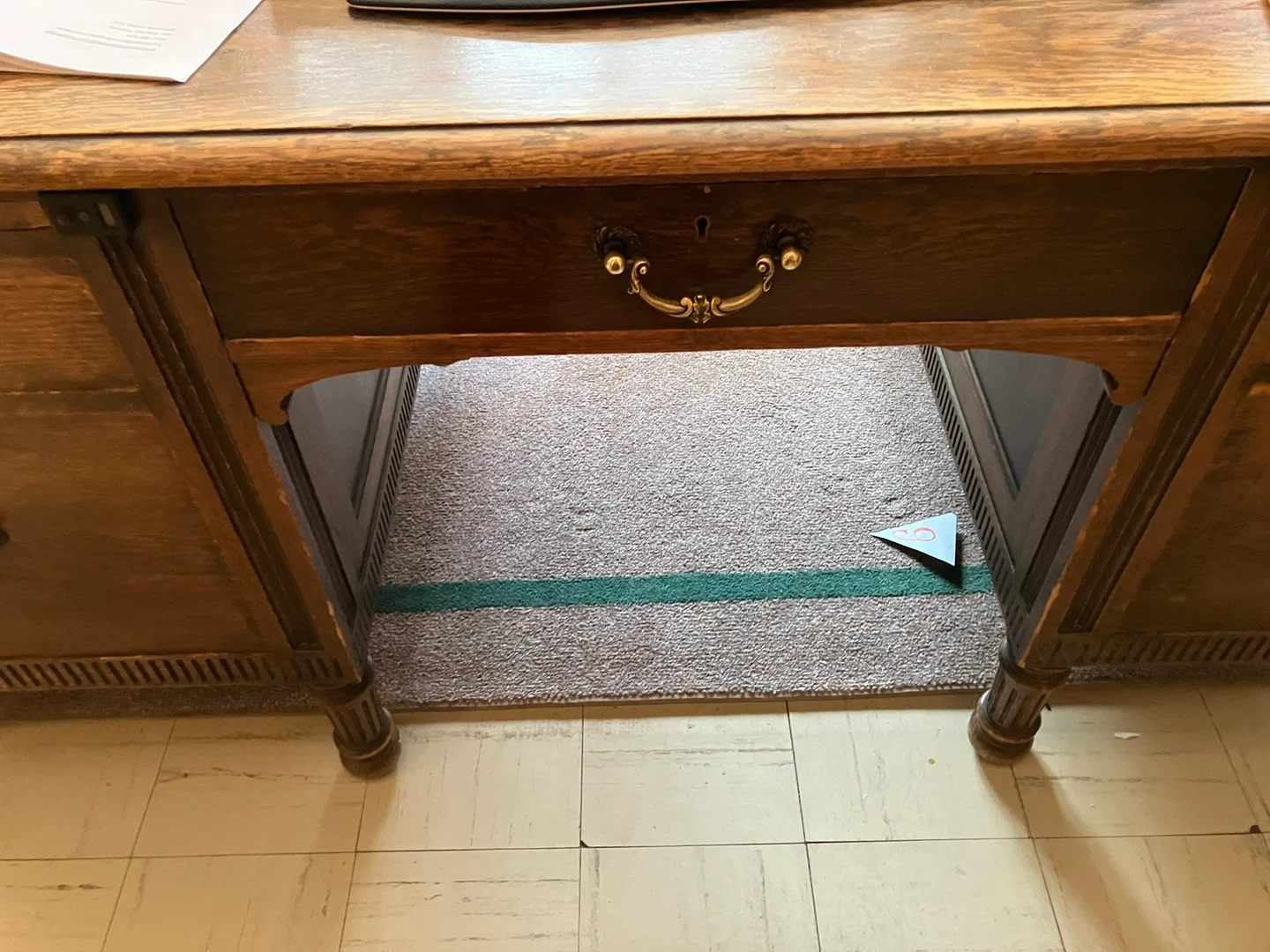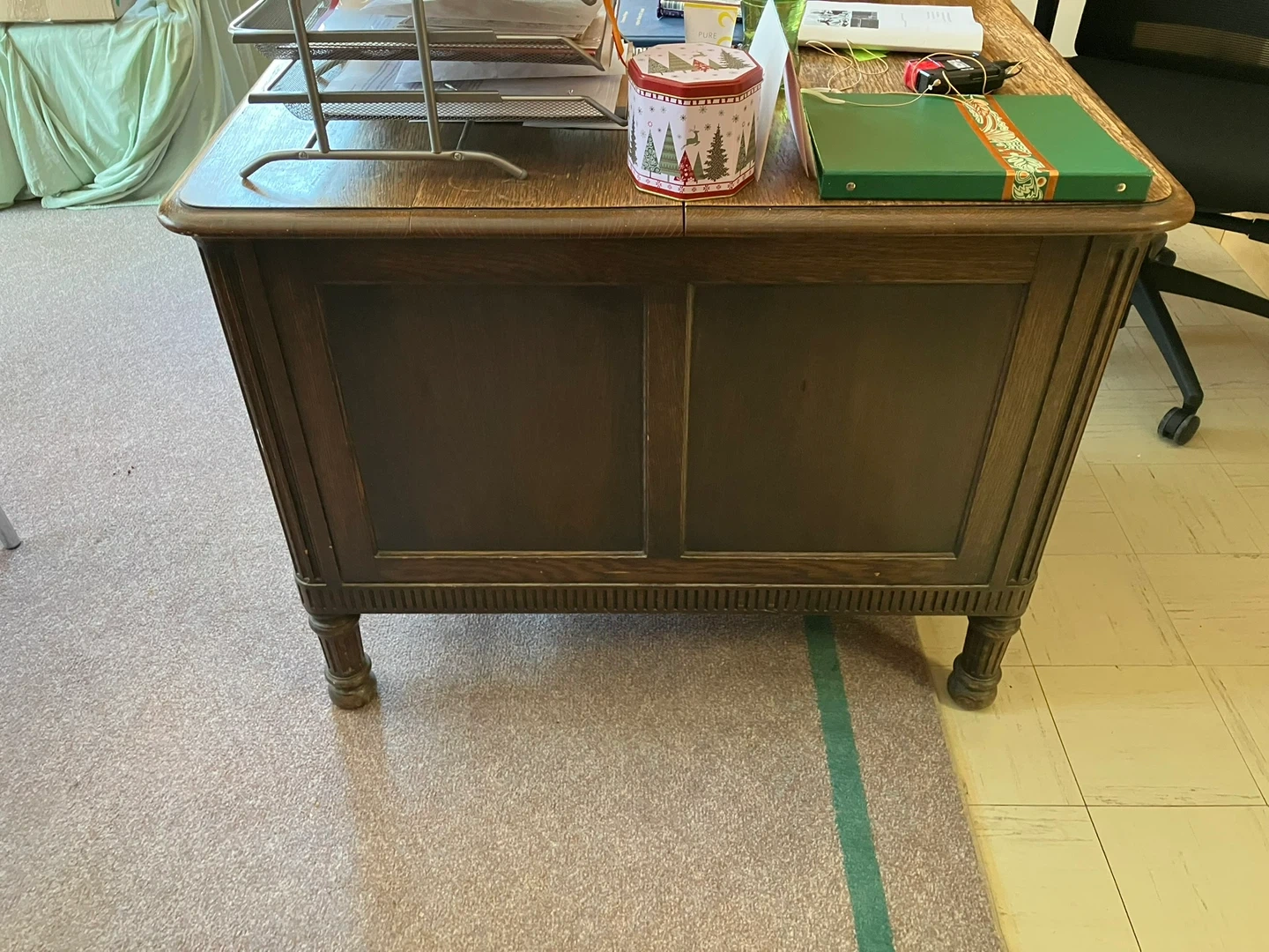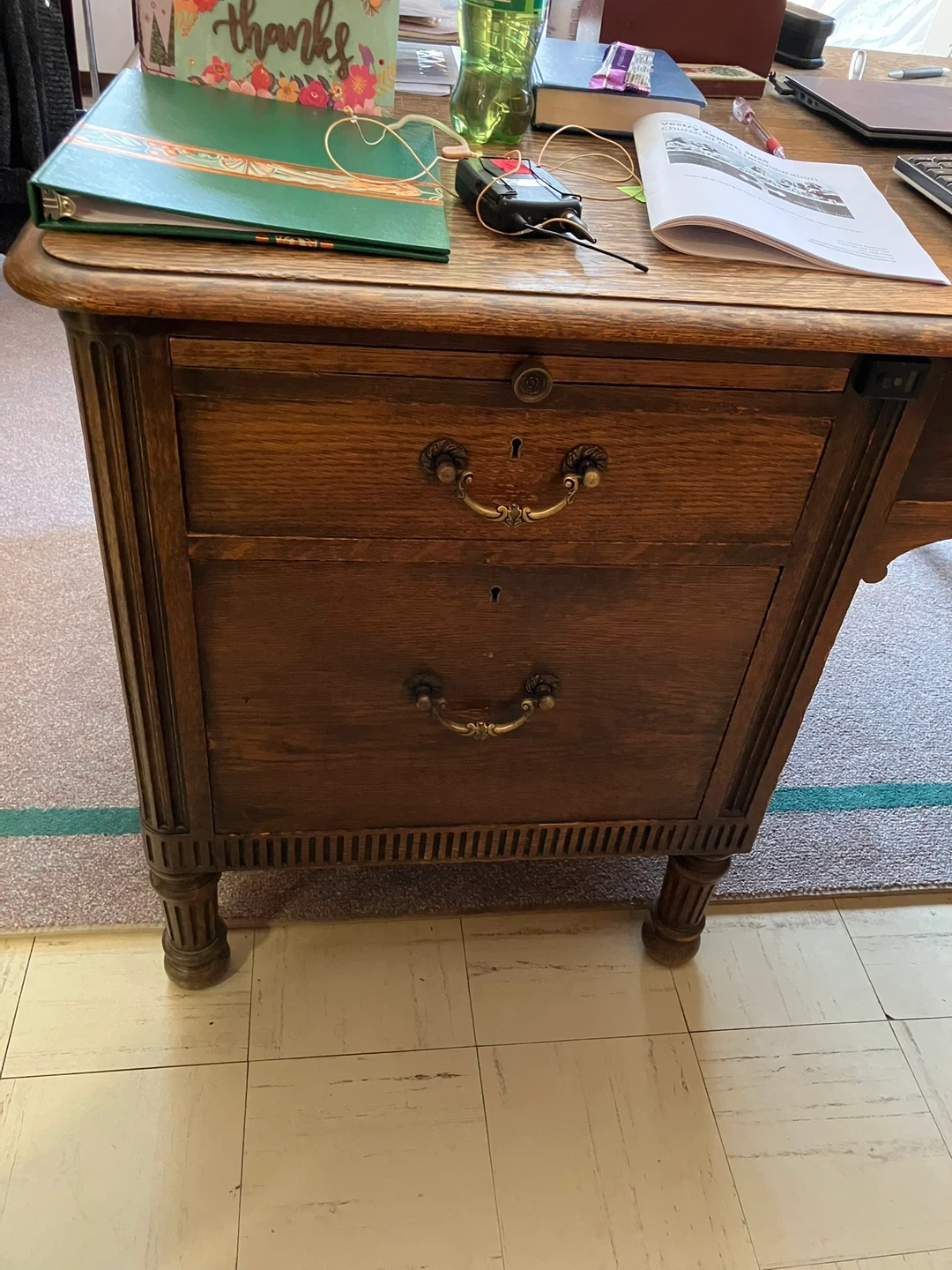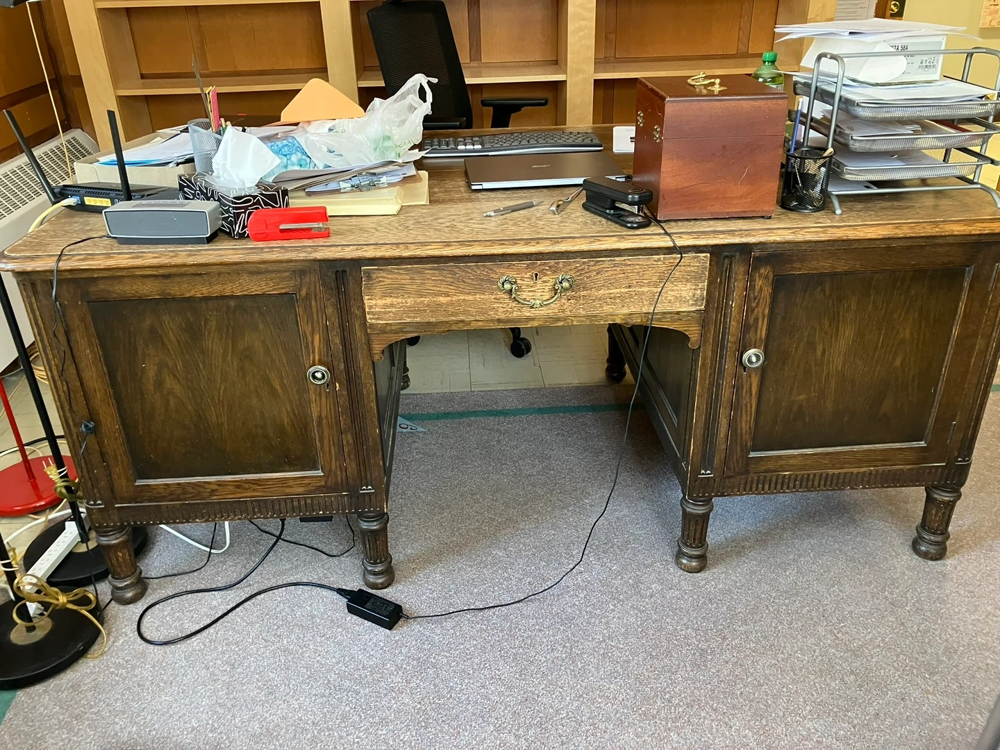 A solid oak antique partner’s desk. It features multiple drawers with ornate hardware. This desk offers ample workspace and storage.