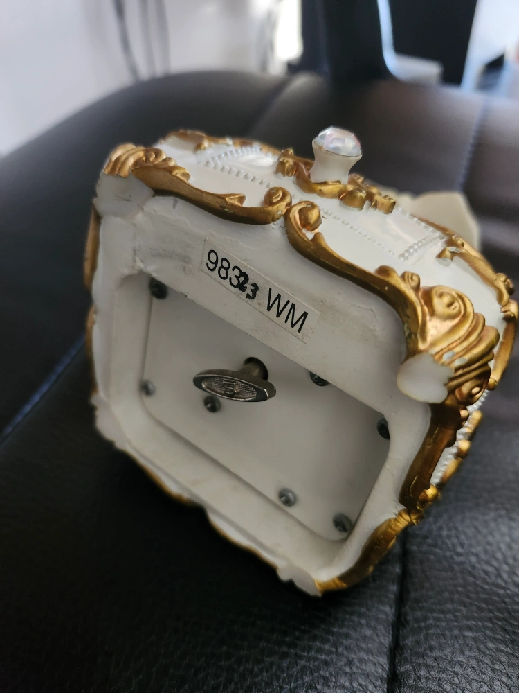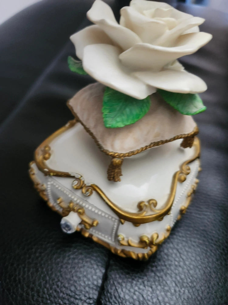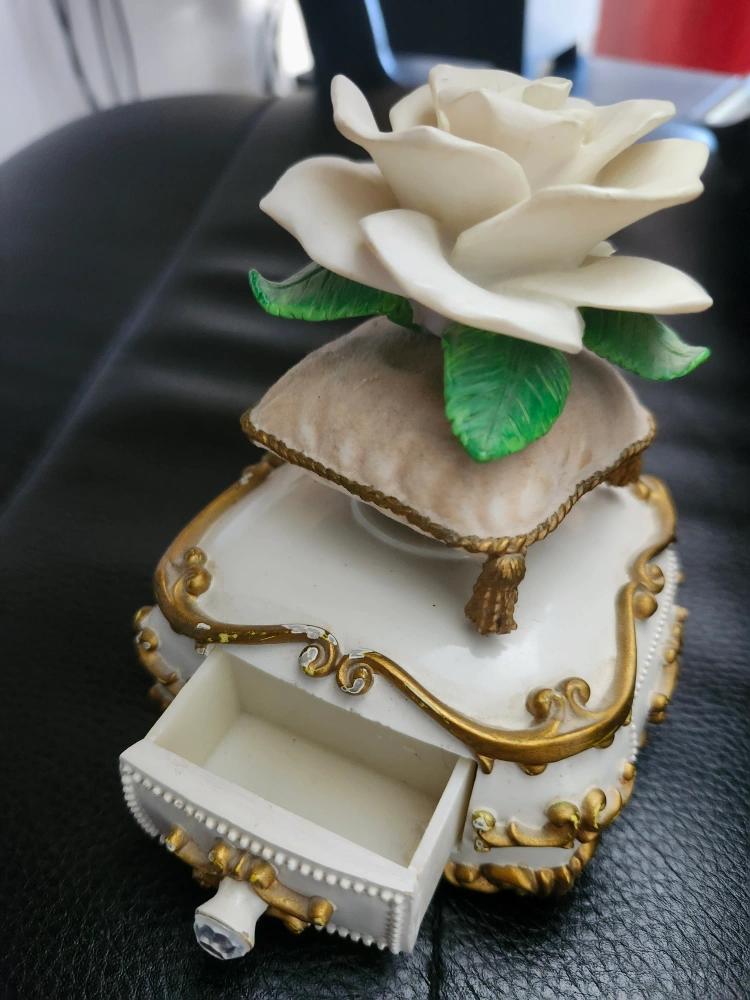 A decorative music box featuring a floral design, complete with an opening drawer. Adorned with gold trim and a decorative cushion. This would look lovely on a dresser as a place to put your precious items.